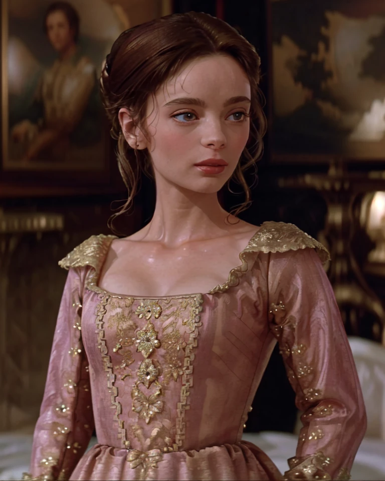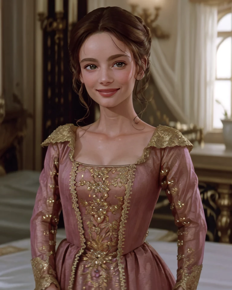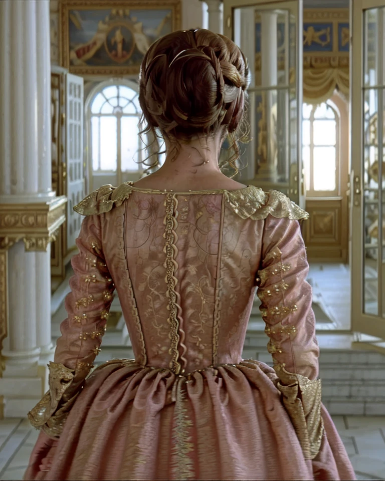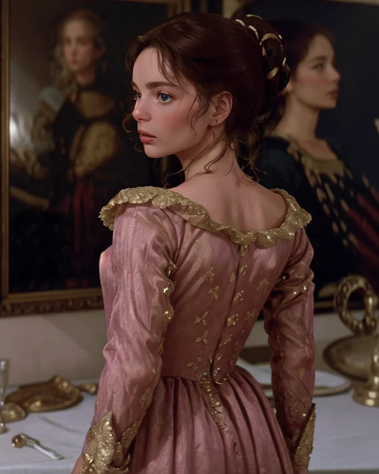 3manne_01, grey eyes, brunette, coiffed hair, hair bun, eyebrows, lips, realistic, pink and gold dress, long sleeves,