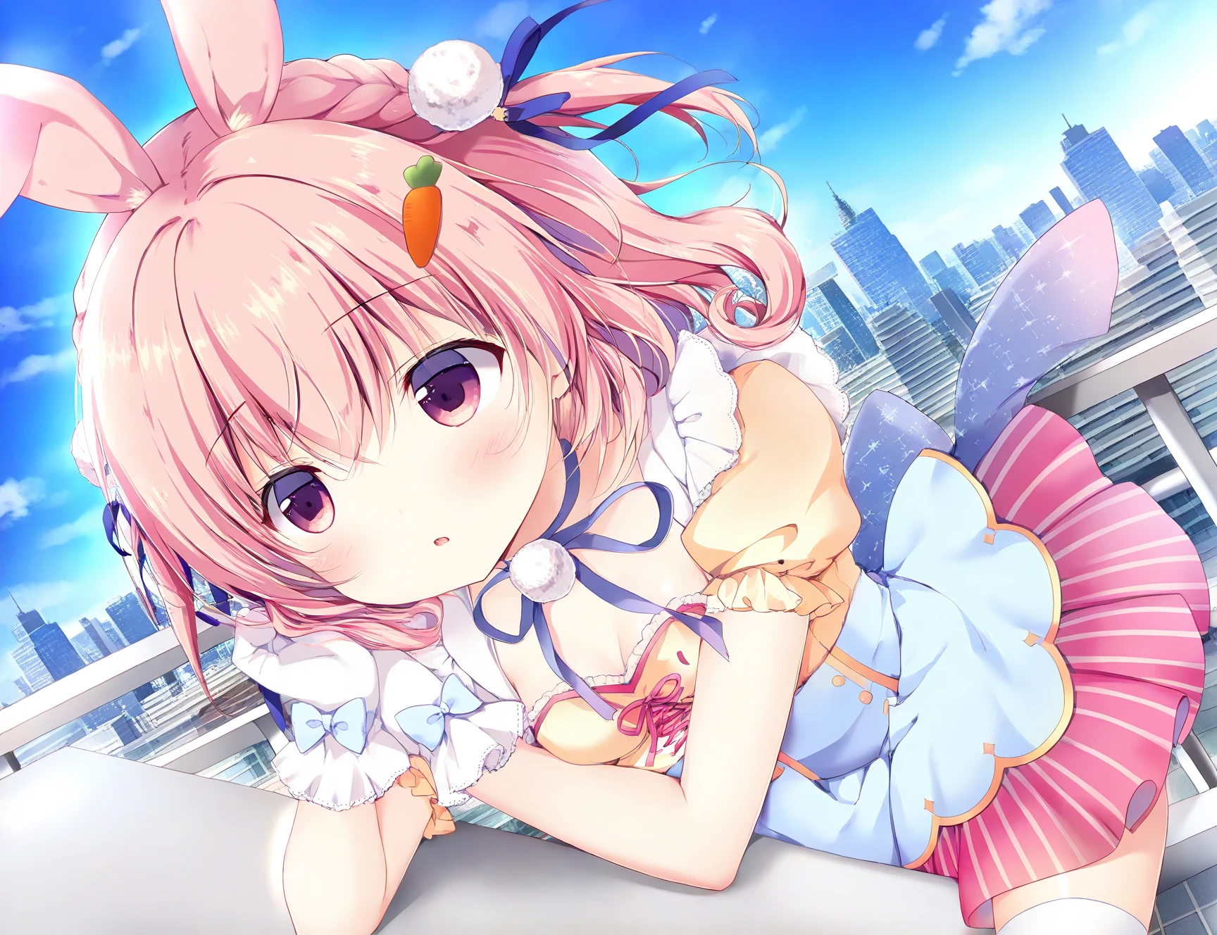 变身服:Shirafuji magic,rabbit ears,hair ornament,white gloves,short sleeves,striped skirt,thighhighs,vertical-striped skirt,carrot hair ornament,white thighhighs,puffy sleeves,puffy short sleeves,blue ribbon,blue bow,striped clothes,pink skirt,pom pom \(clothes\),pleated skirt,vertical-striped clothes,neck ribbon,blue skirt,blue apron,frilled details,pink bow,white lace gloves,frilled skirt,golden trim,pink boots,pompom shoes,white thigh highs,