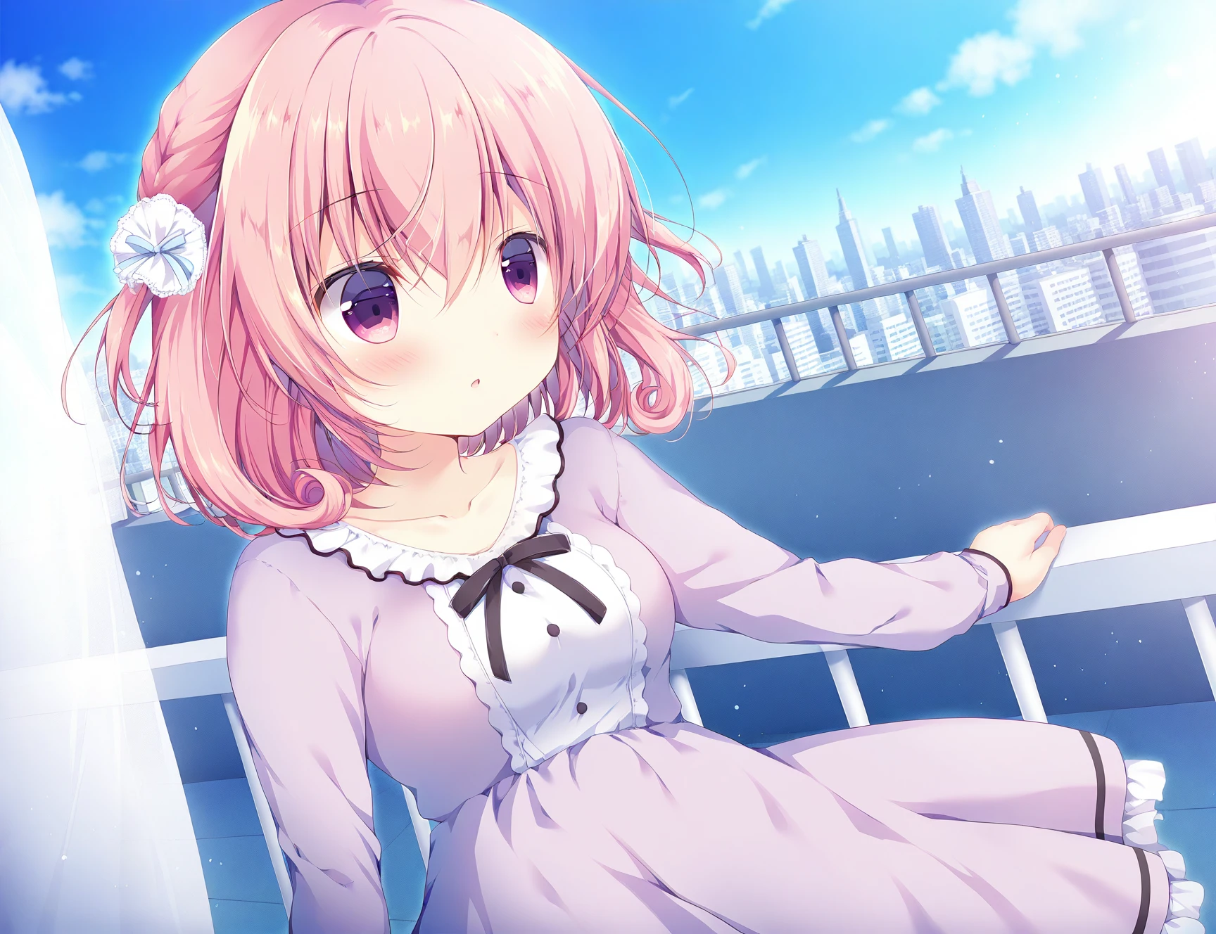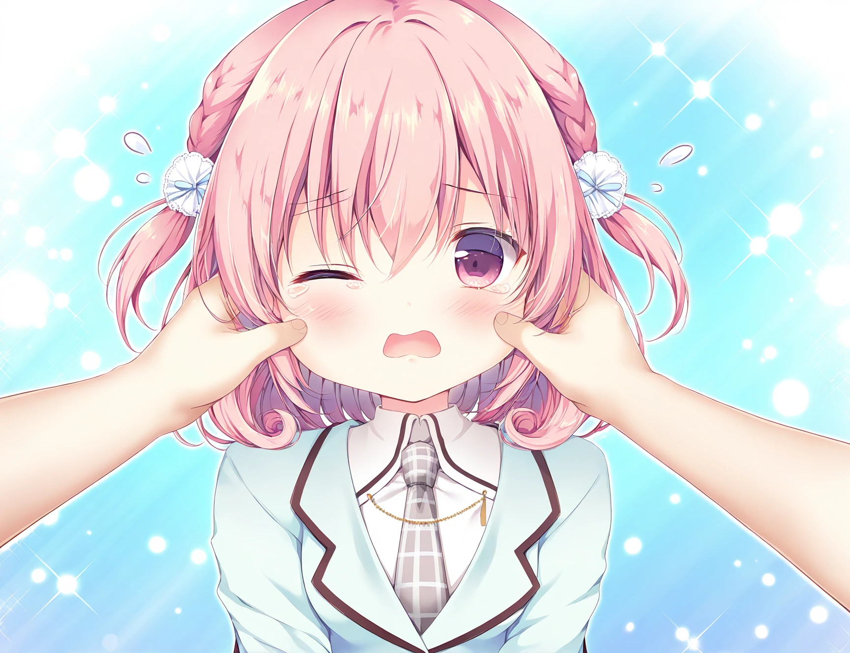 角色特征:Shirafuji Yuna,1girl,solo,braid,hair ornament,two side up,pink eyes