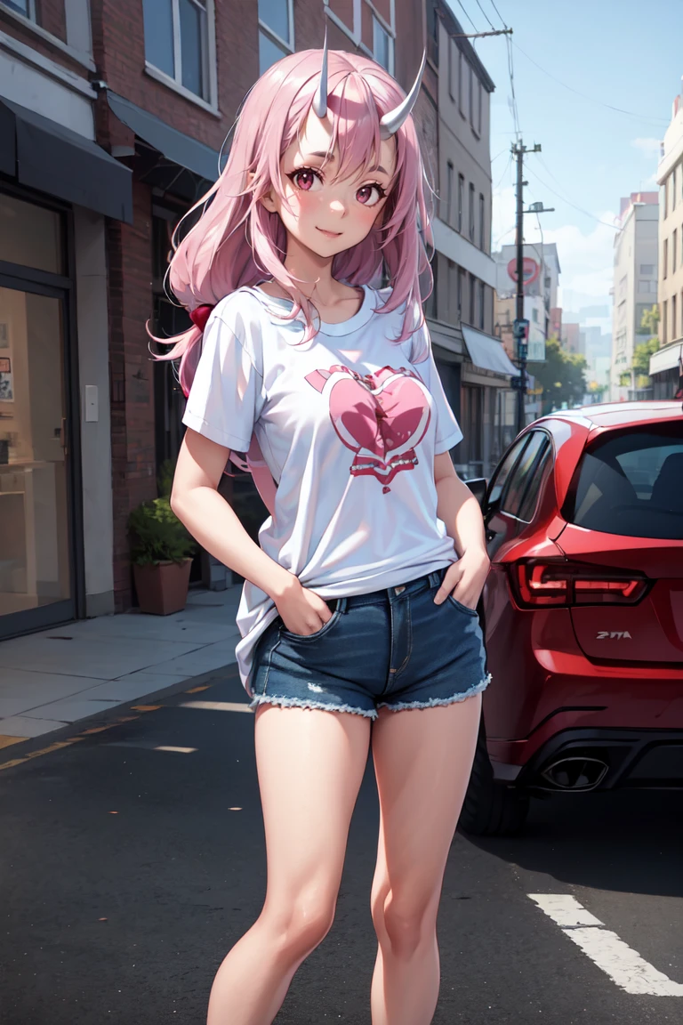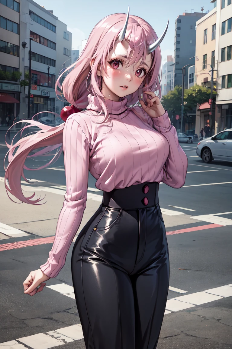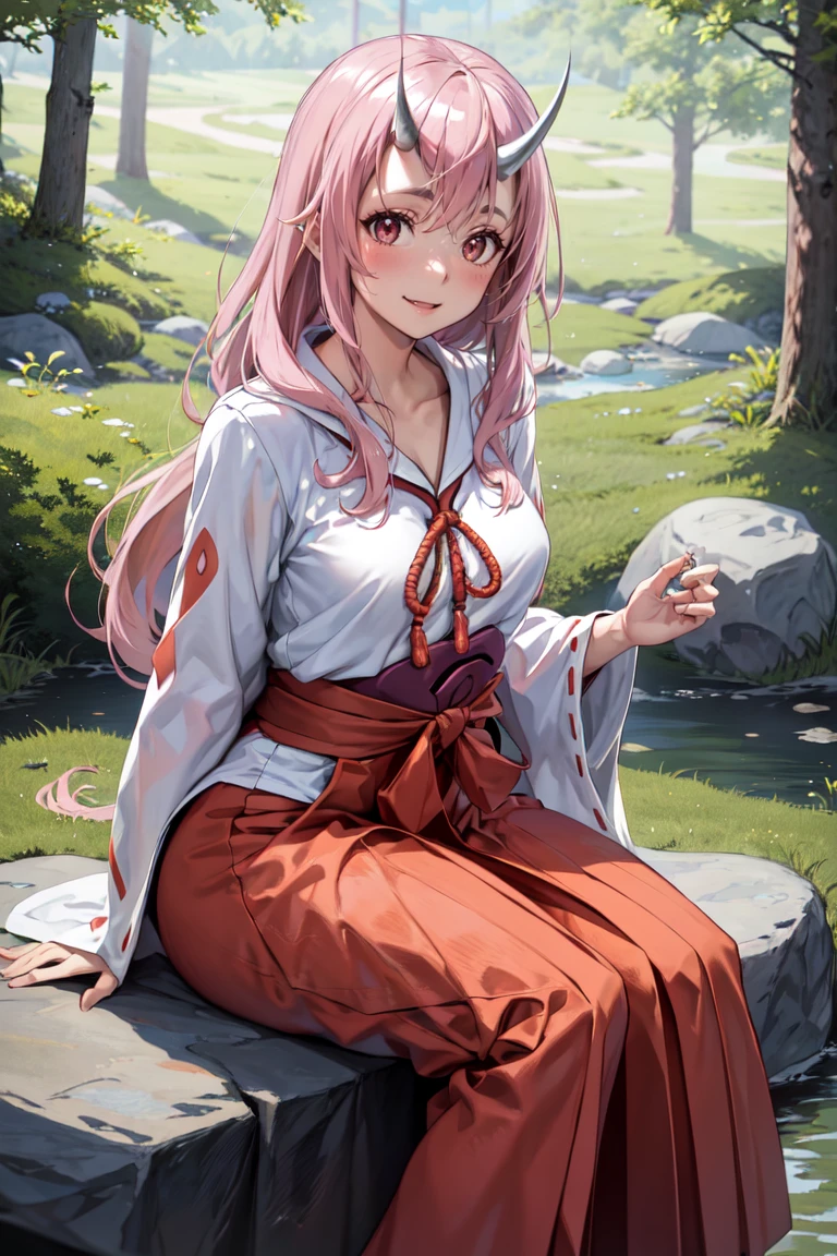 Add "low-tied long hair, oni horns" for her standard appearance.