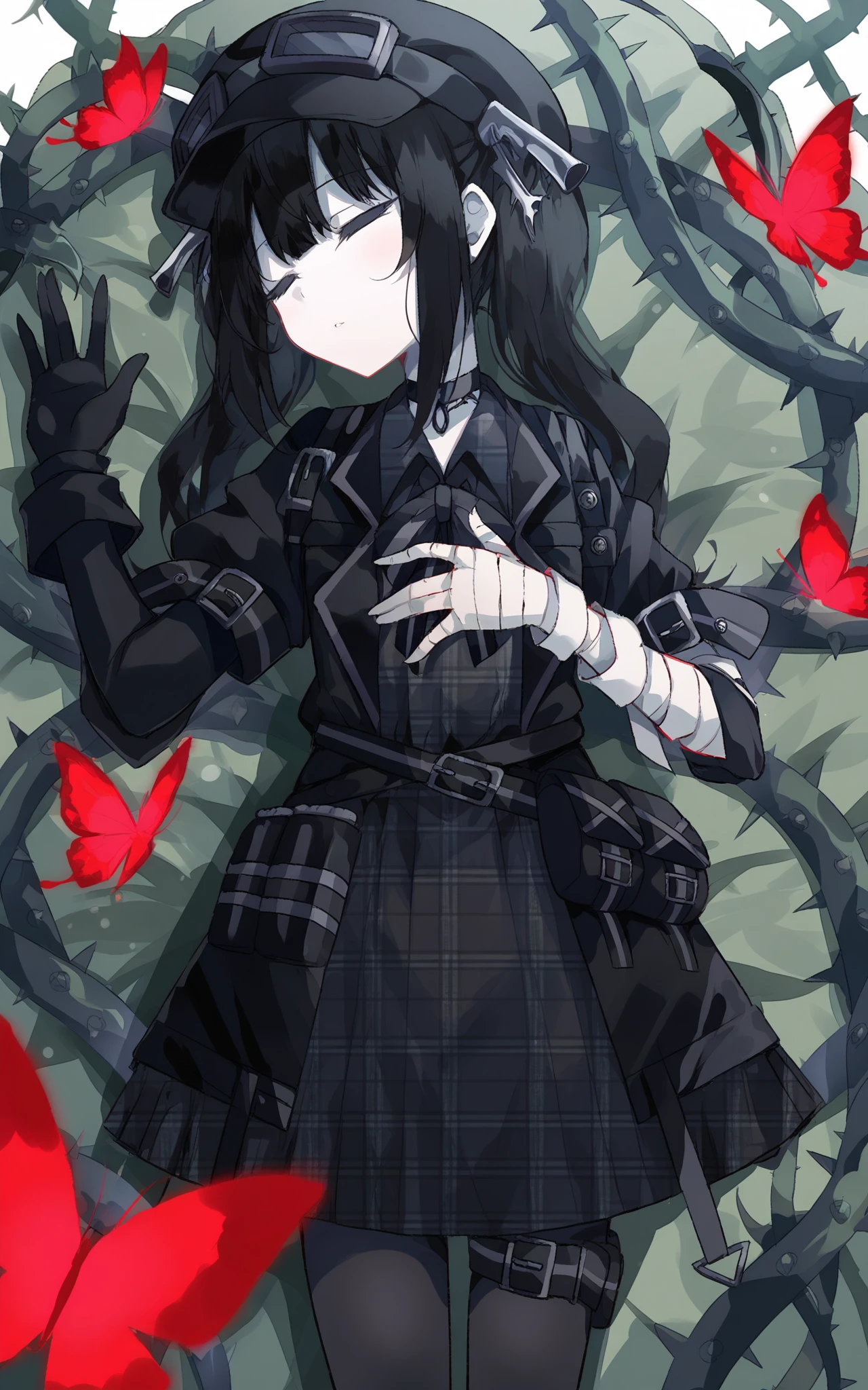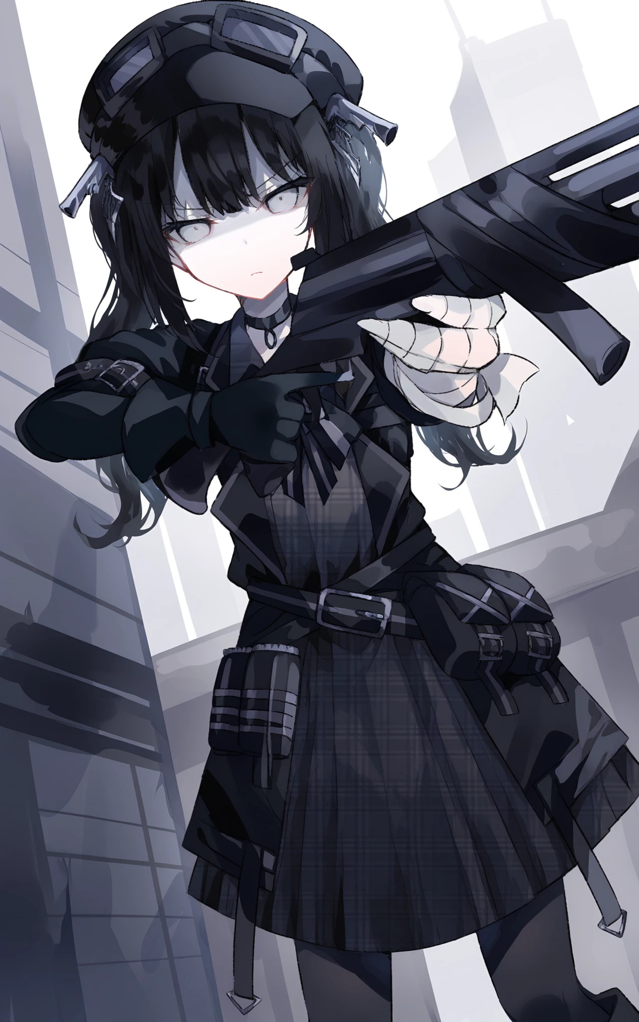 服饰:black headwear,goggles on headwear,black jacket,open jacket,black dress,plaid dress,black bow,striped bow,puffy short sleeves,buckle,black belt,multiple belts,belt buckle,arm belt,bandaged arm,single glove,black gloves,left belt pouch,right belt pouch,black pantyhose,double leg ring,belt boots