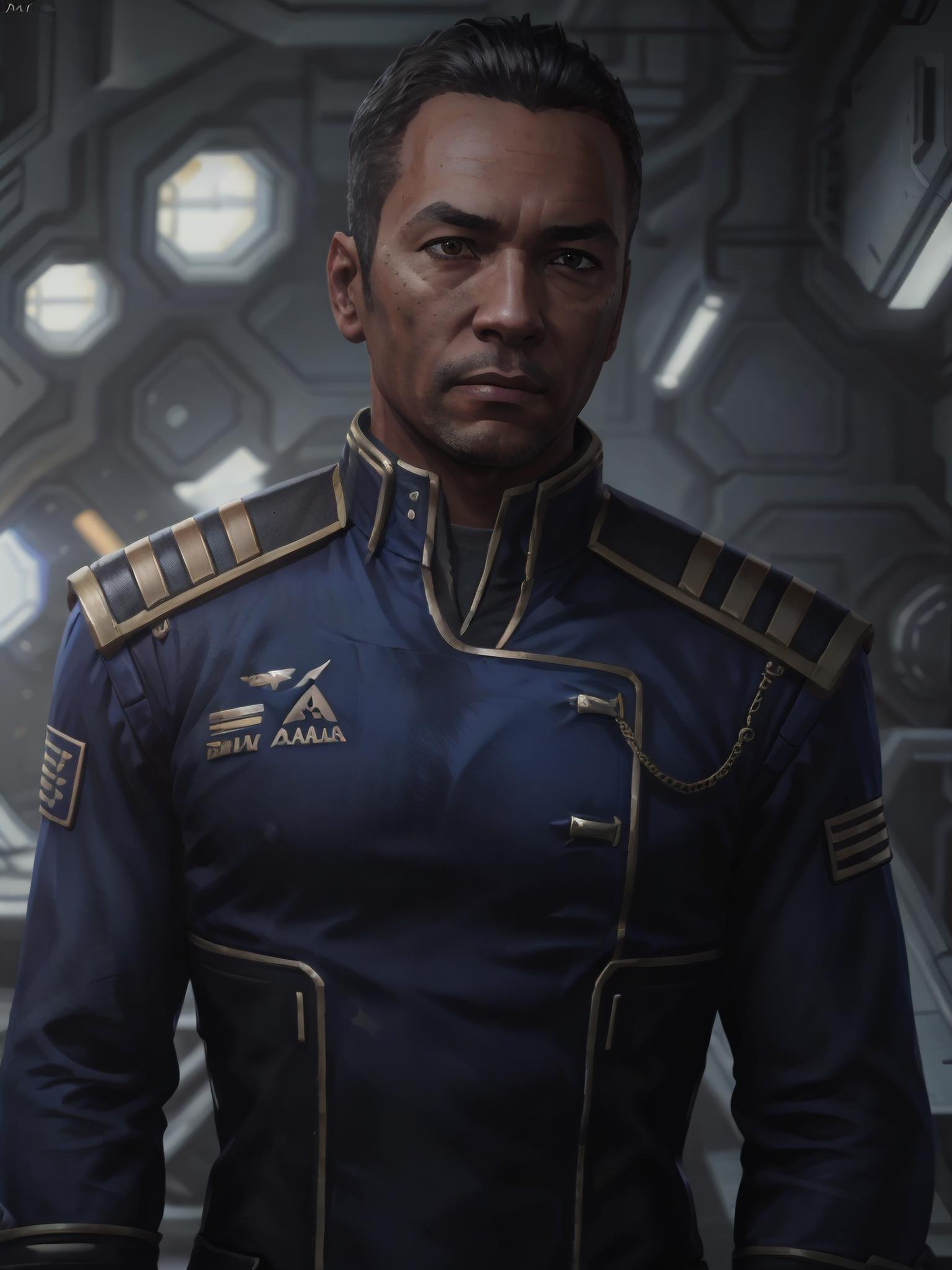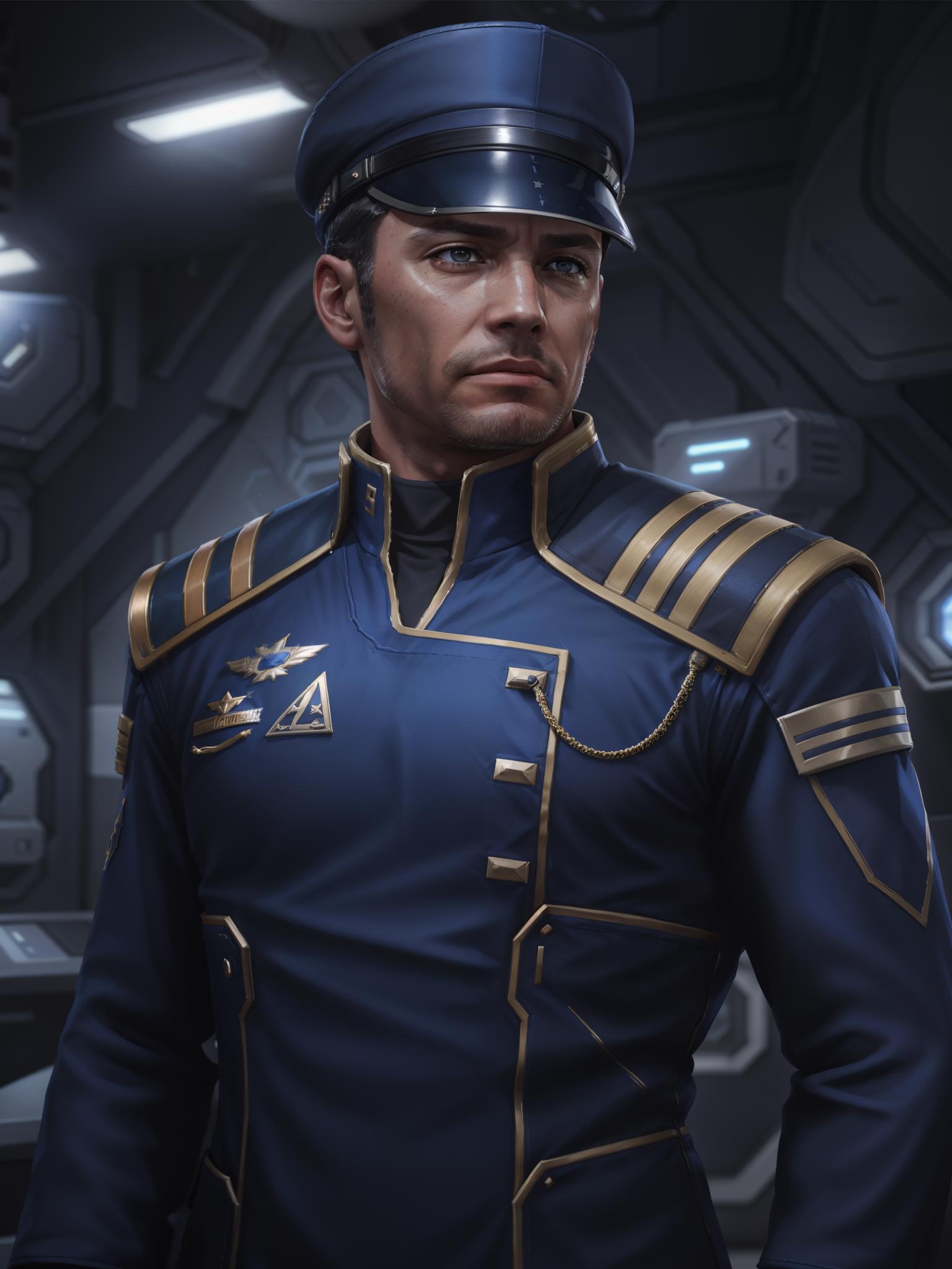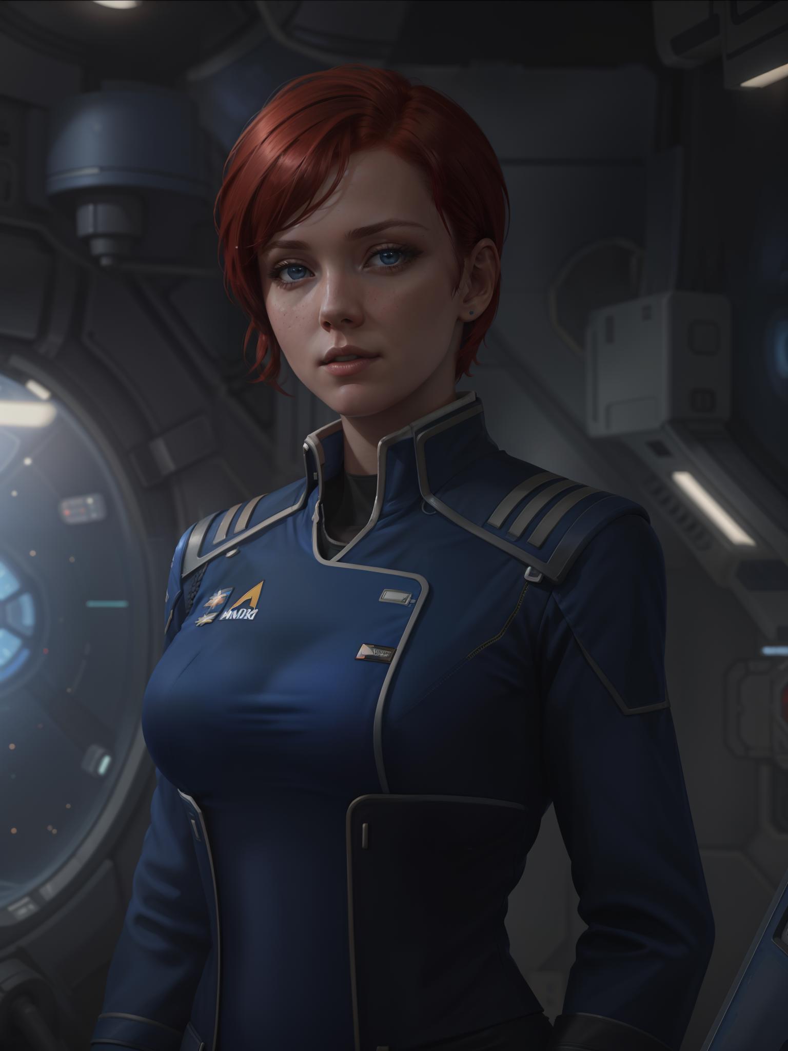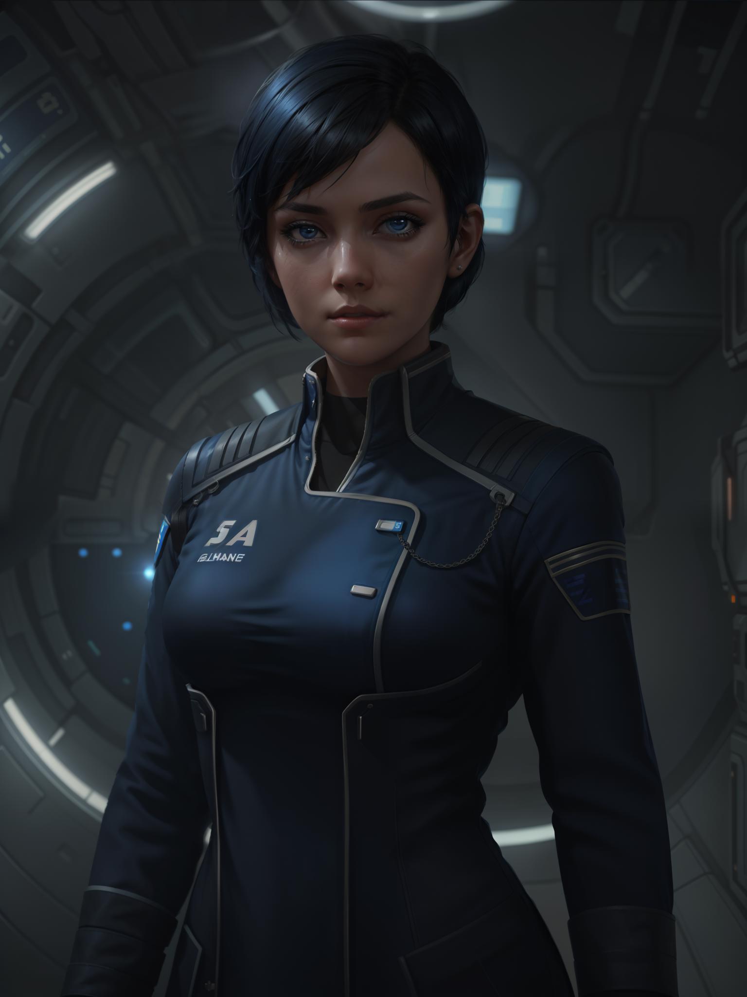 Example promts; a woman with short black hair wearing allianceuniform in a space station / a man wearing allianceuniform in space station.