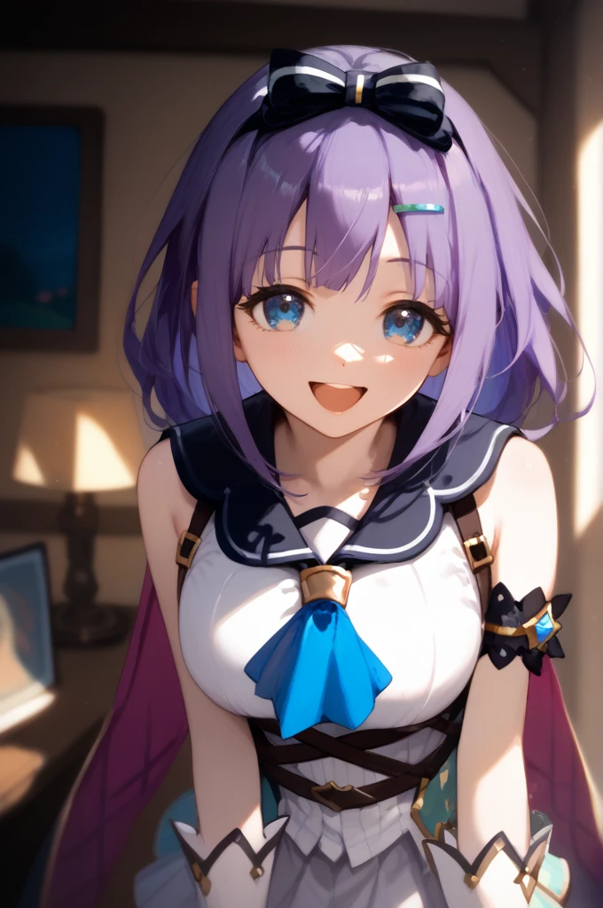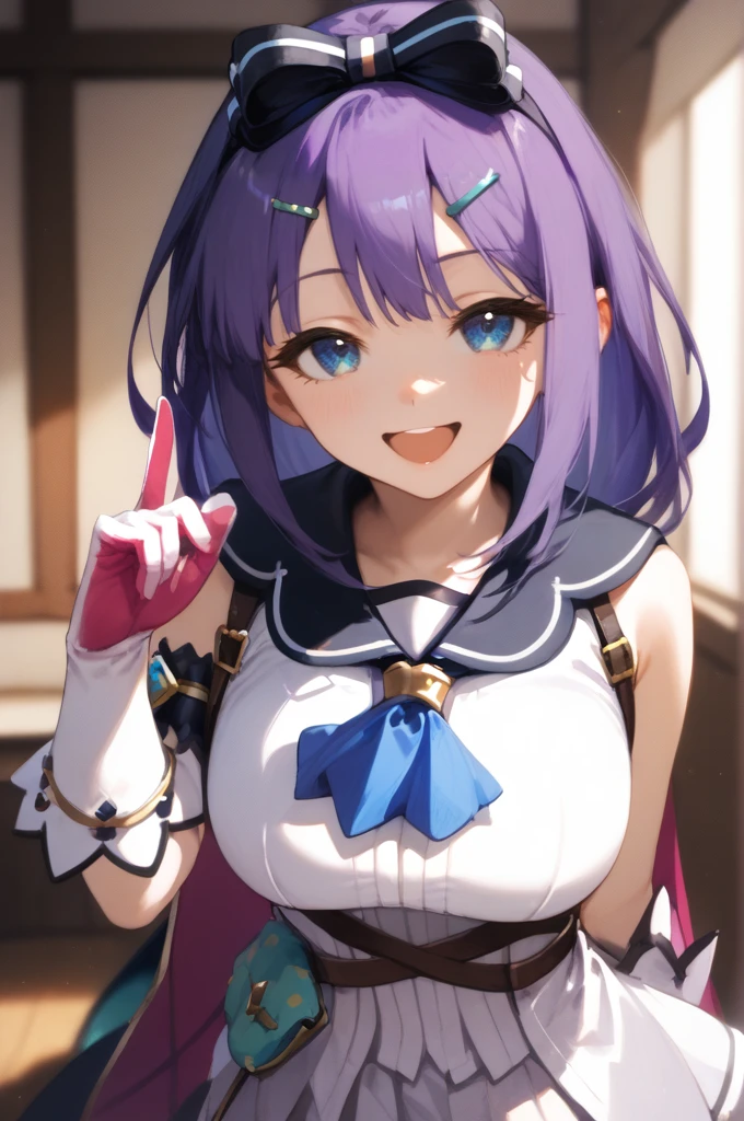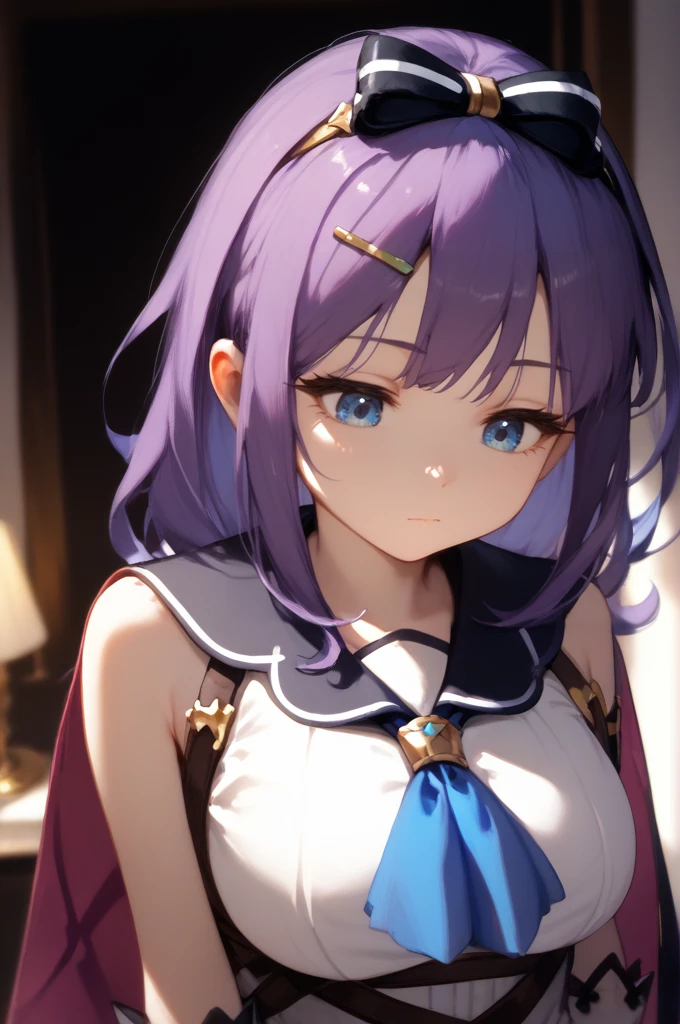 misora \(princess connect!\),long hair,purple hair,blue eyes,hairclip,hairband,hair ornament,shirt,black sailor collar,blue ascot,white gloves,sleeveless,