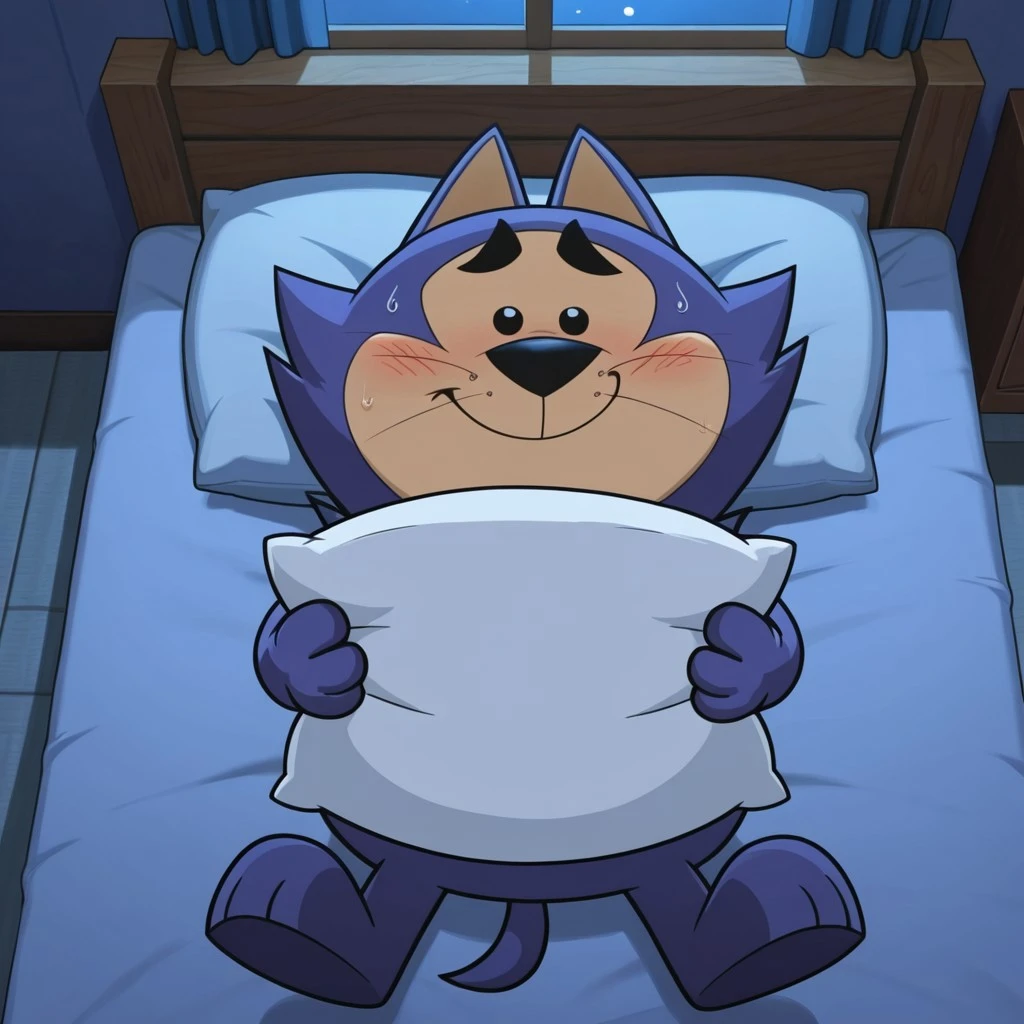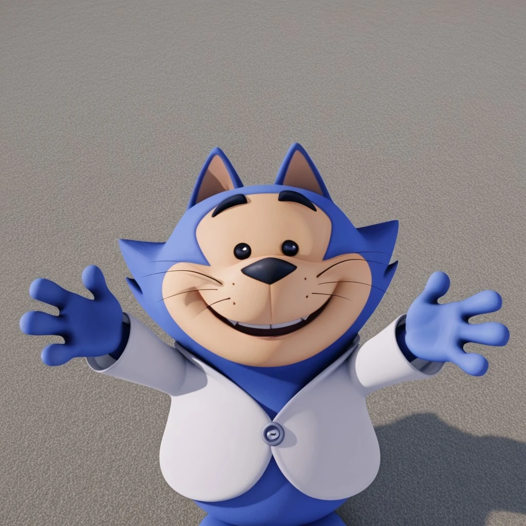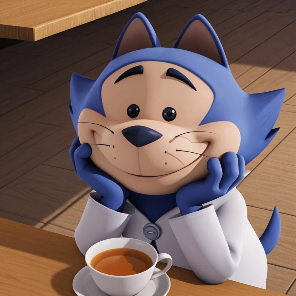 Tags (2011): 2d, 2d (artwork), blue fur, two-tone fur, cat, furry male, feline, no sclera, black eyes, circular eyes, black eyebrows, thick eyebrows, tail, whiskers, black nose, white cardigan, long sleeves, button,