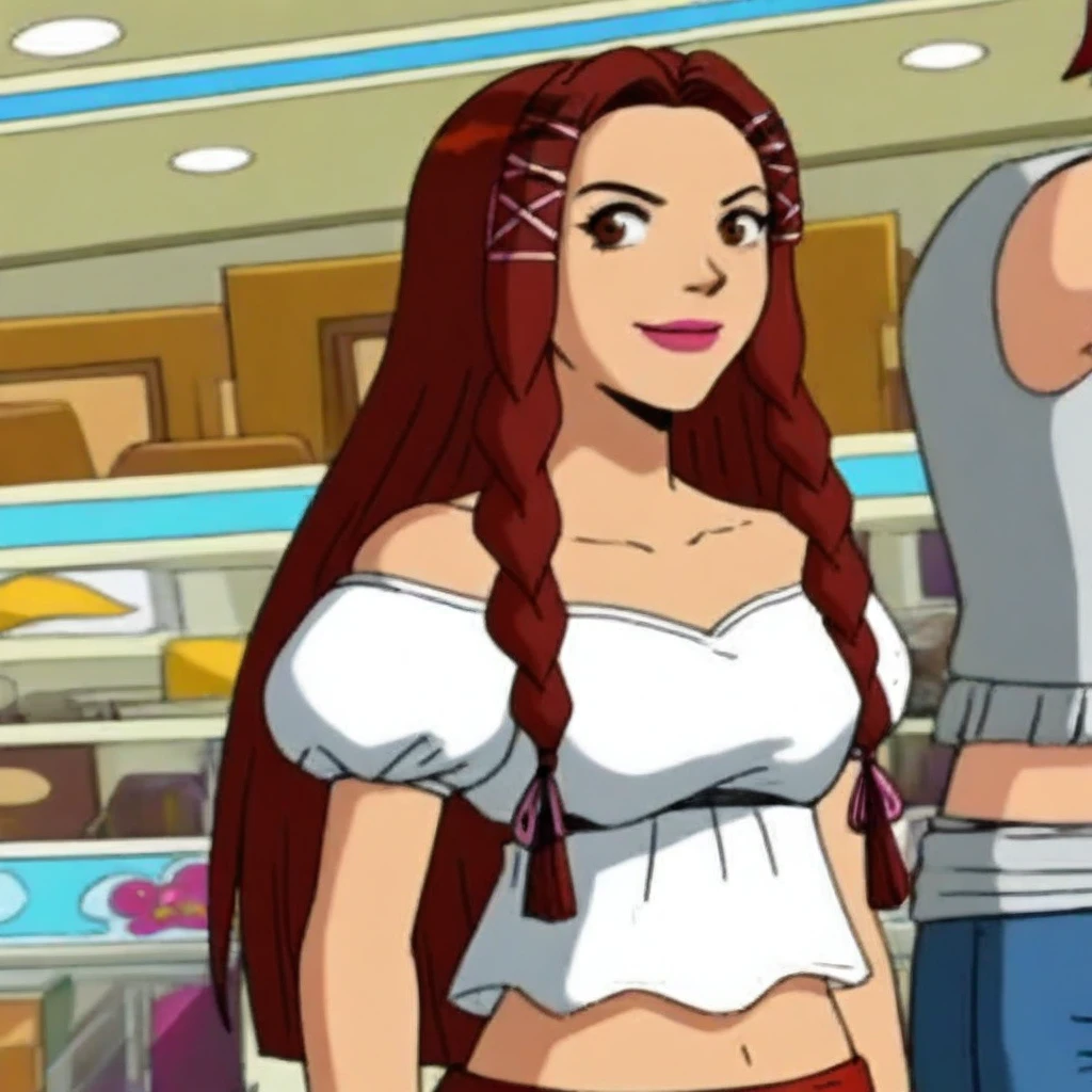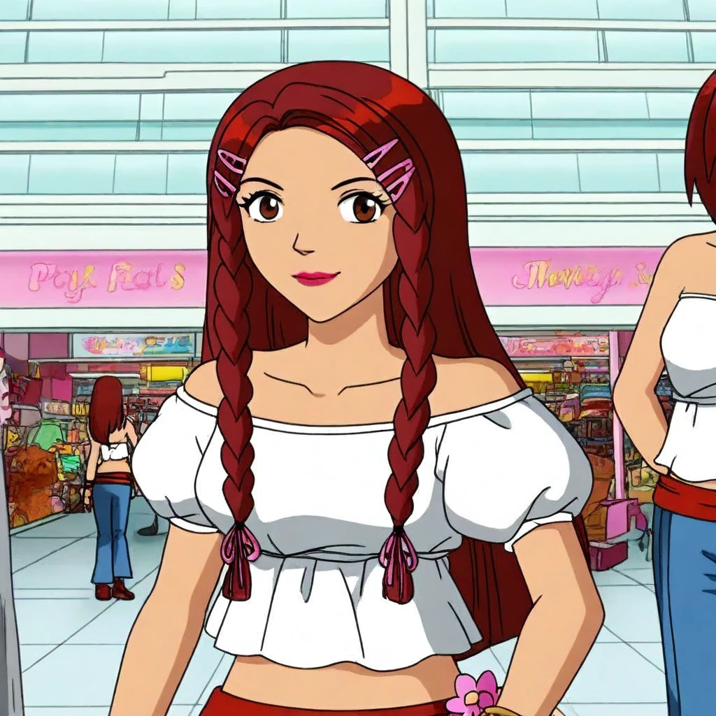 solo, 1girl, Jill_ts, brown eyes, red hair, long hair, twin braids, lipstick, pink ribbon hairclips,