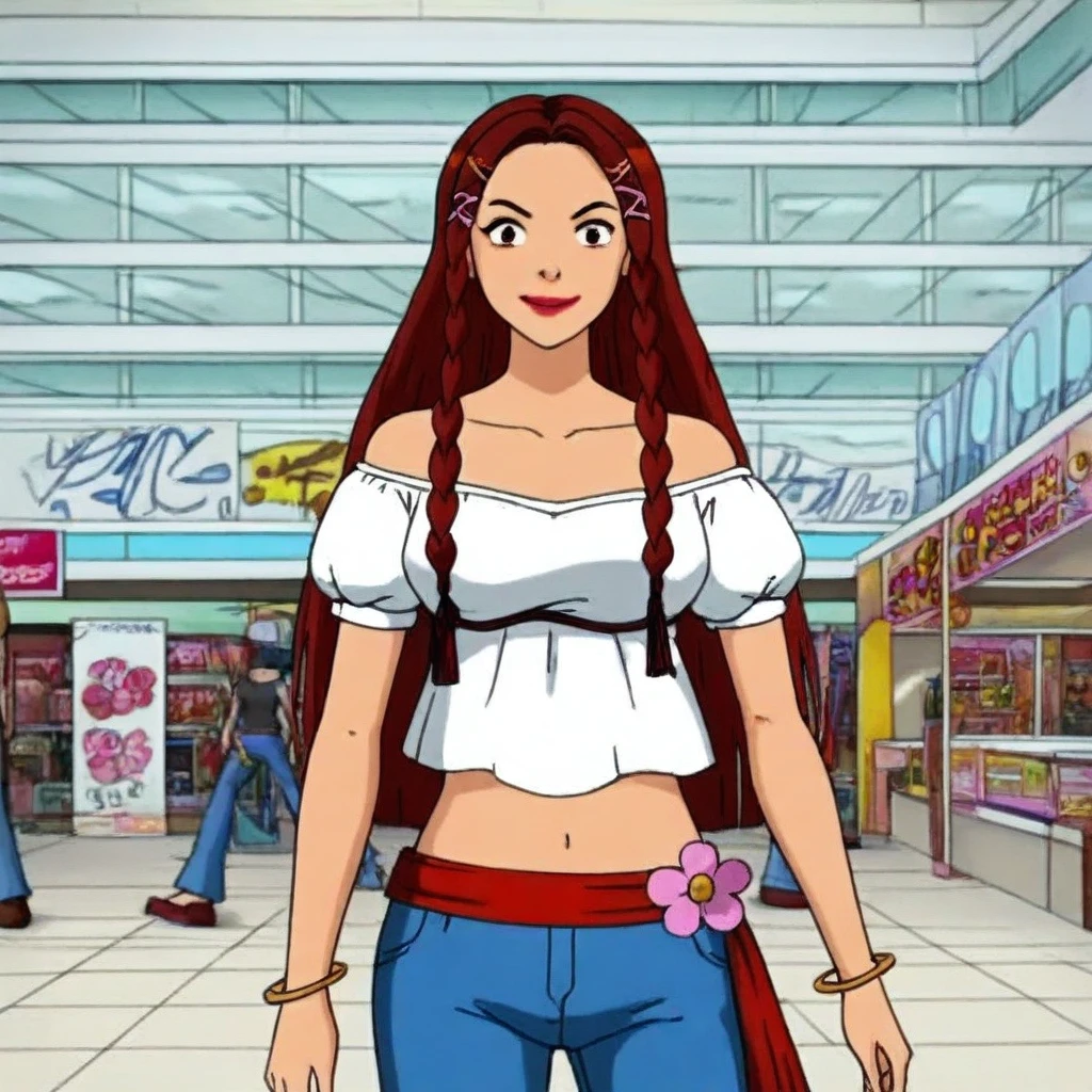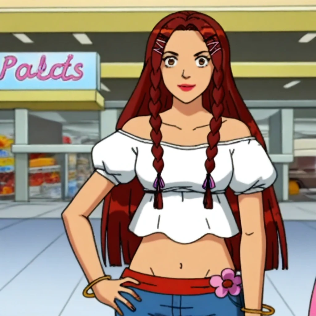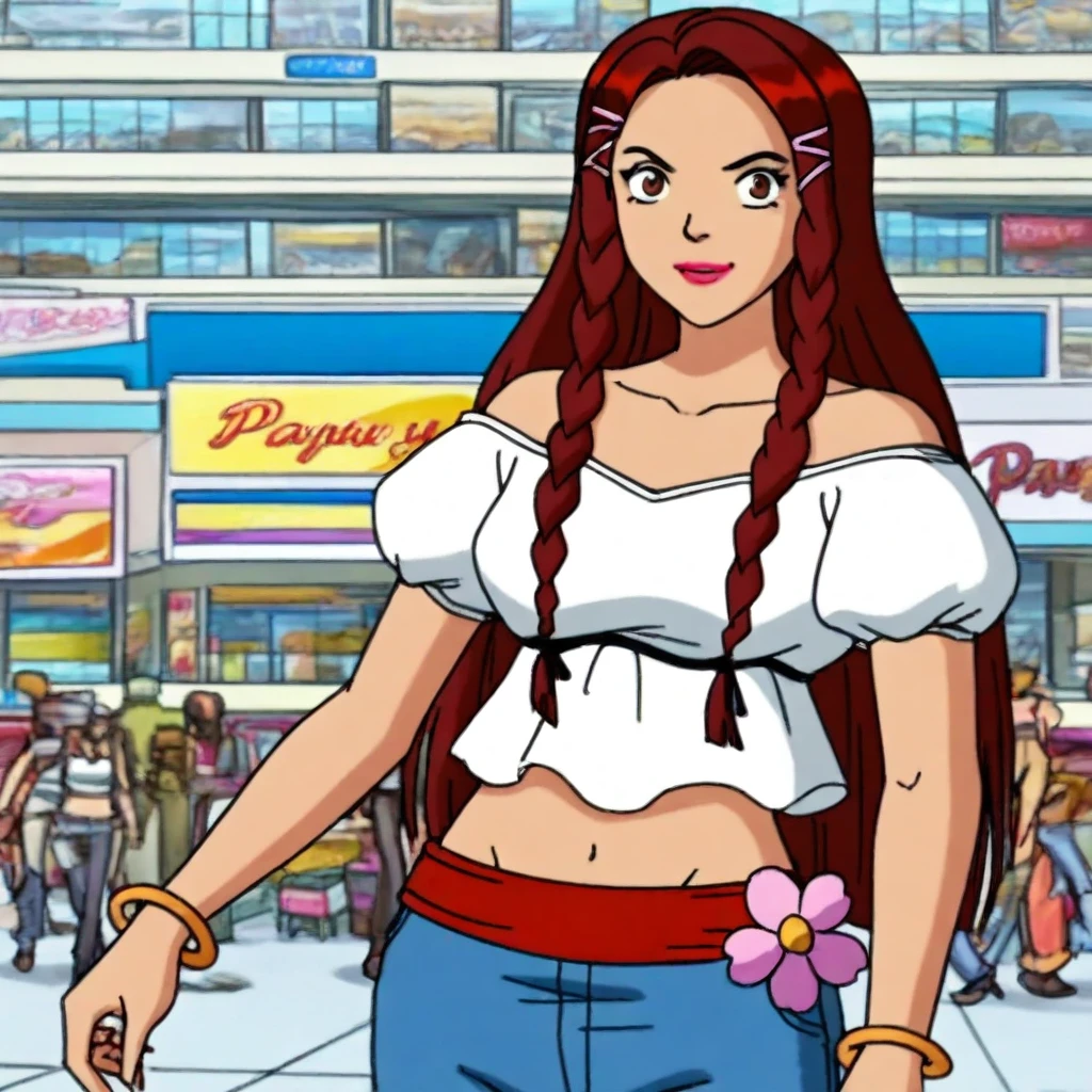 white off-shoulder top, puffy short sleeves, midriff, blue flared jeans, pink flower accessory, red waistband, bracelets, brown platform sandals,
