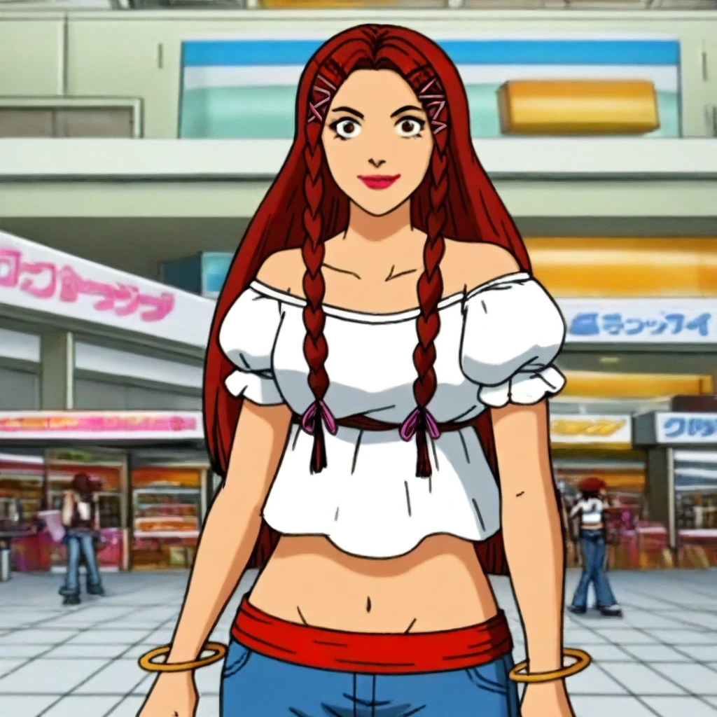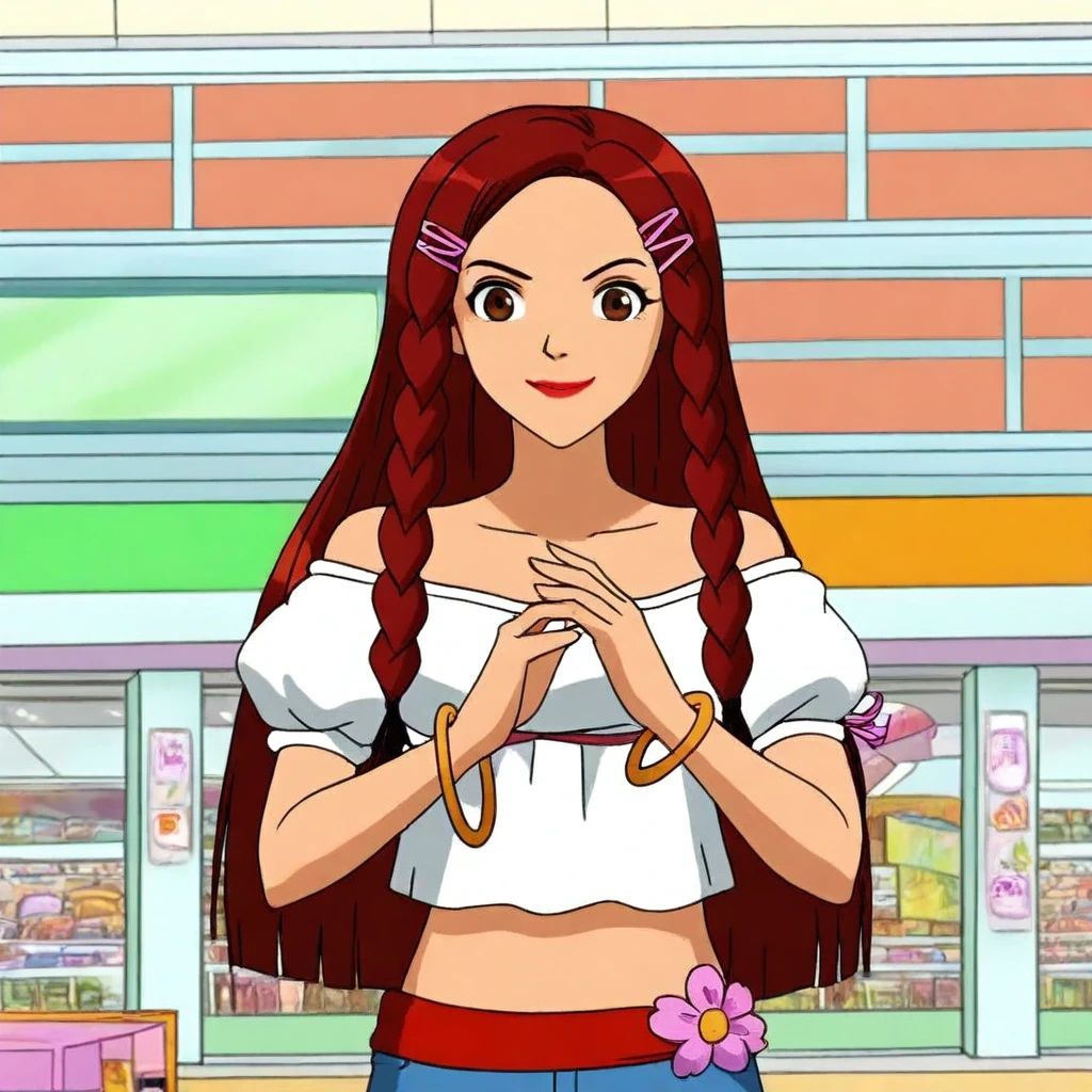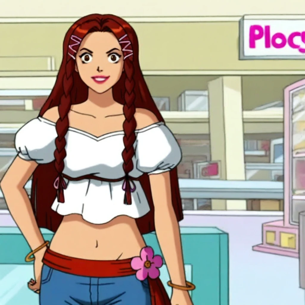 white off-shoulder top, puffy short sleeves, midriff, blue flared jeans, pink flower accessory, red waistband, bracelets, brown platform sandals,