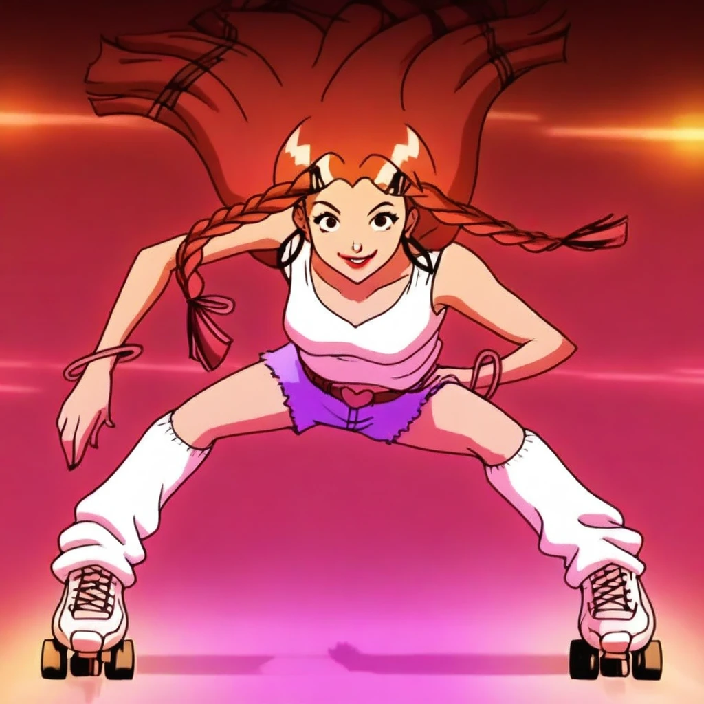 hoop earrings, white top, sleeveles, blue shorts, red belt, pink heart shaped belt buckle, white knee-high socks, roller skates,