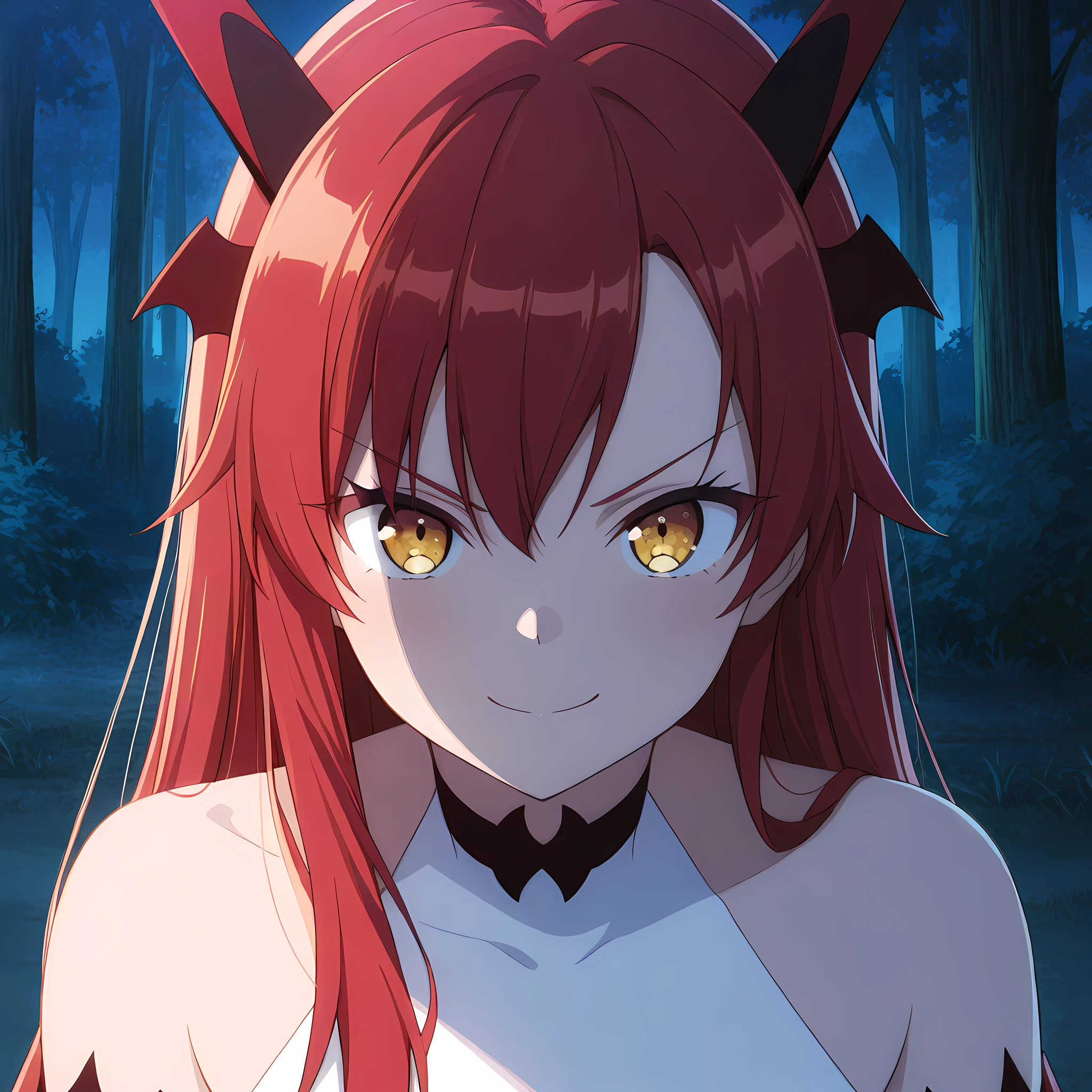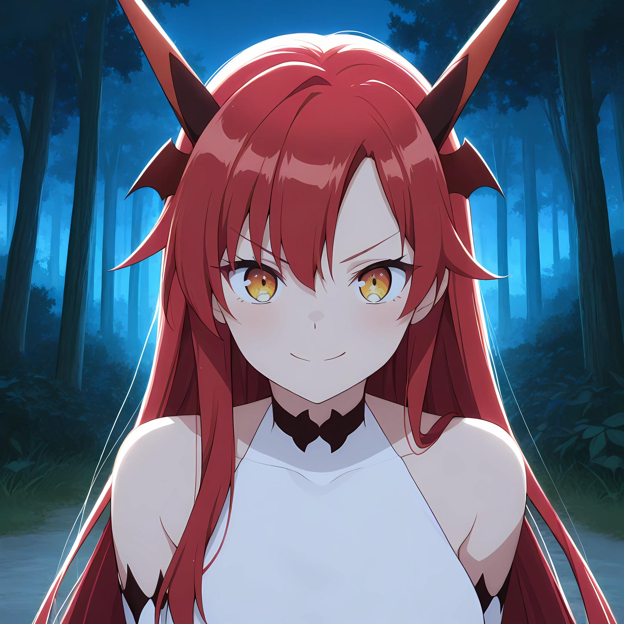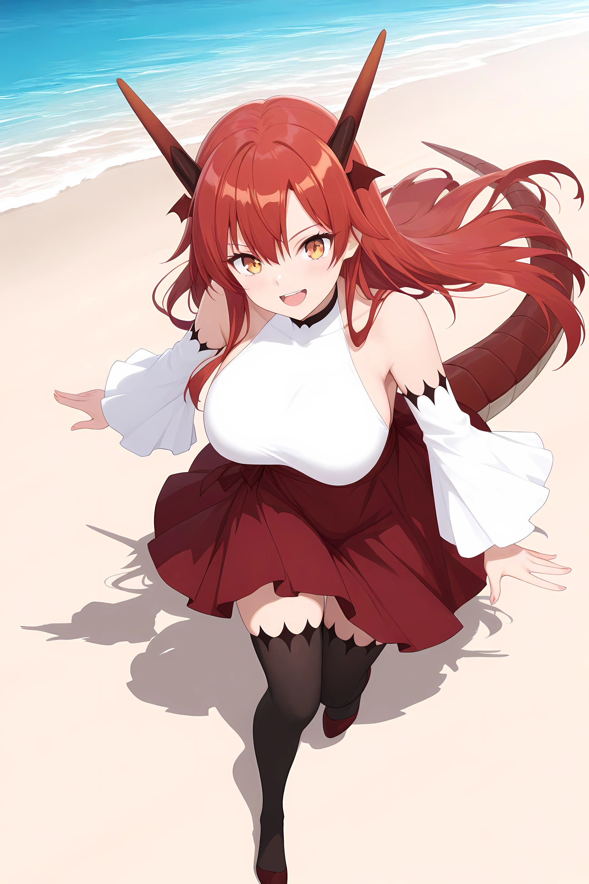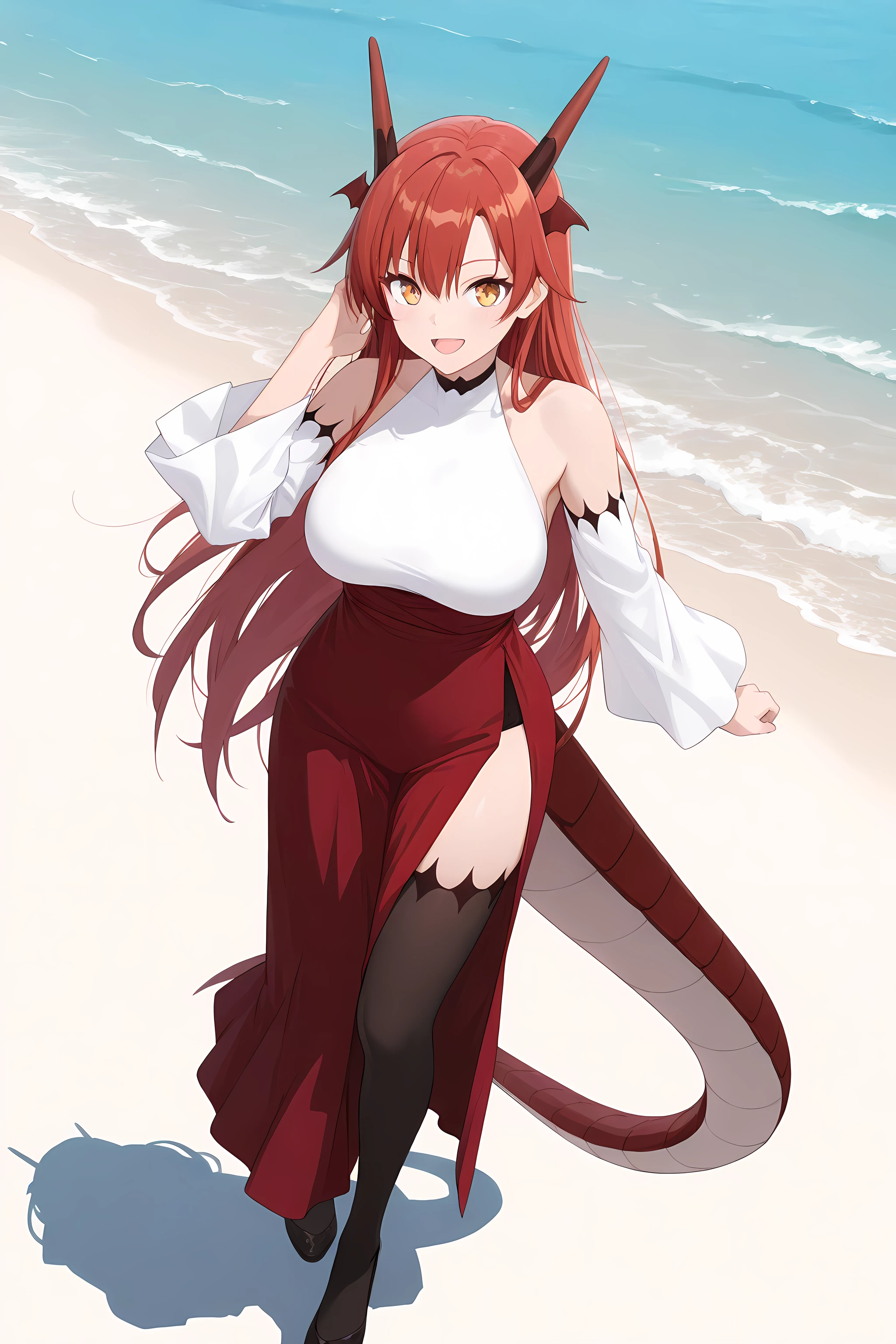 tania_bt, 1girl, yellow eyes, large breasts, horns, tail, thighhighs, red hair, long skirt, dragon tail, dragon girl, long hair, black thighhighs, detached sleeves, dragon horns,