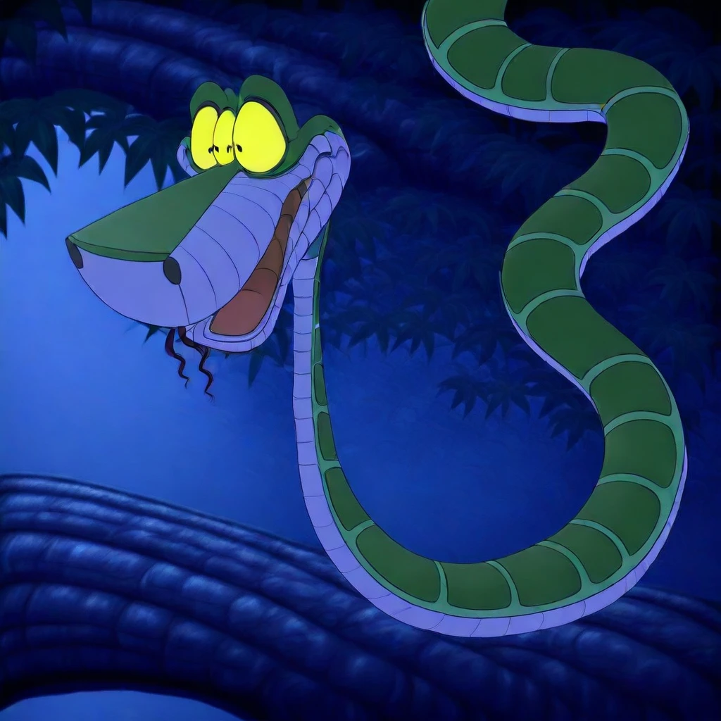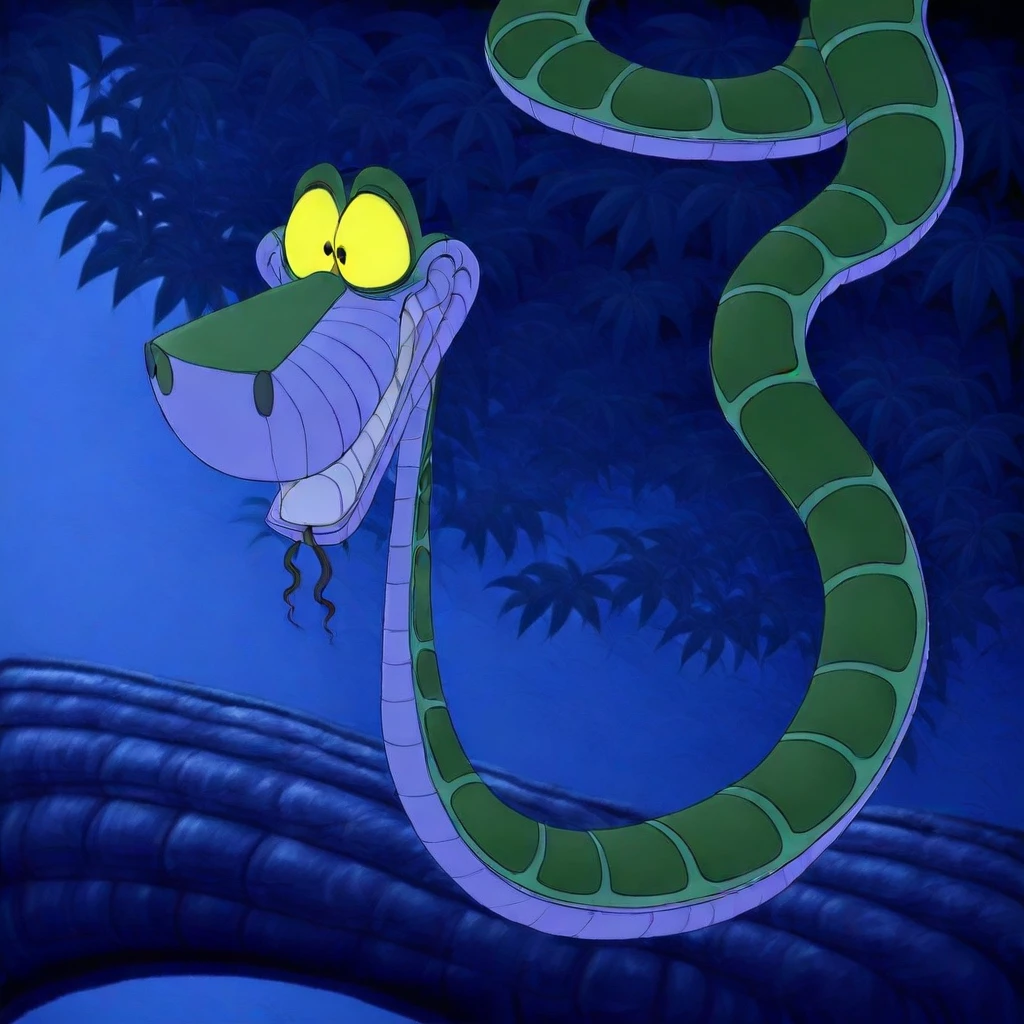 kaa the snake from jungle book 2 identical colors identical face snake coils aniamted xl 2d disney. no humans snake black eyes solo tree retro artstyle tongue