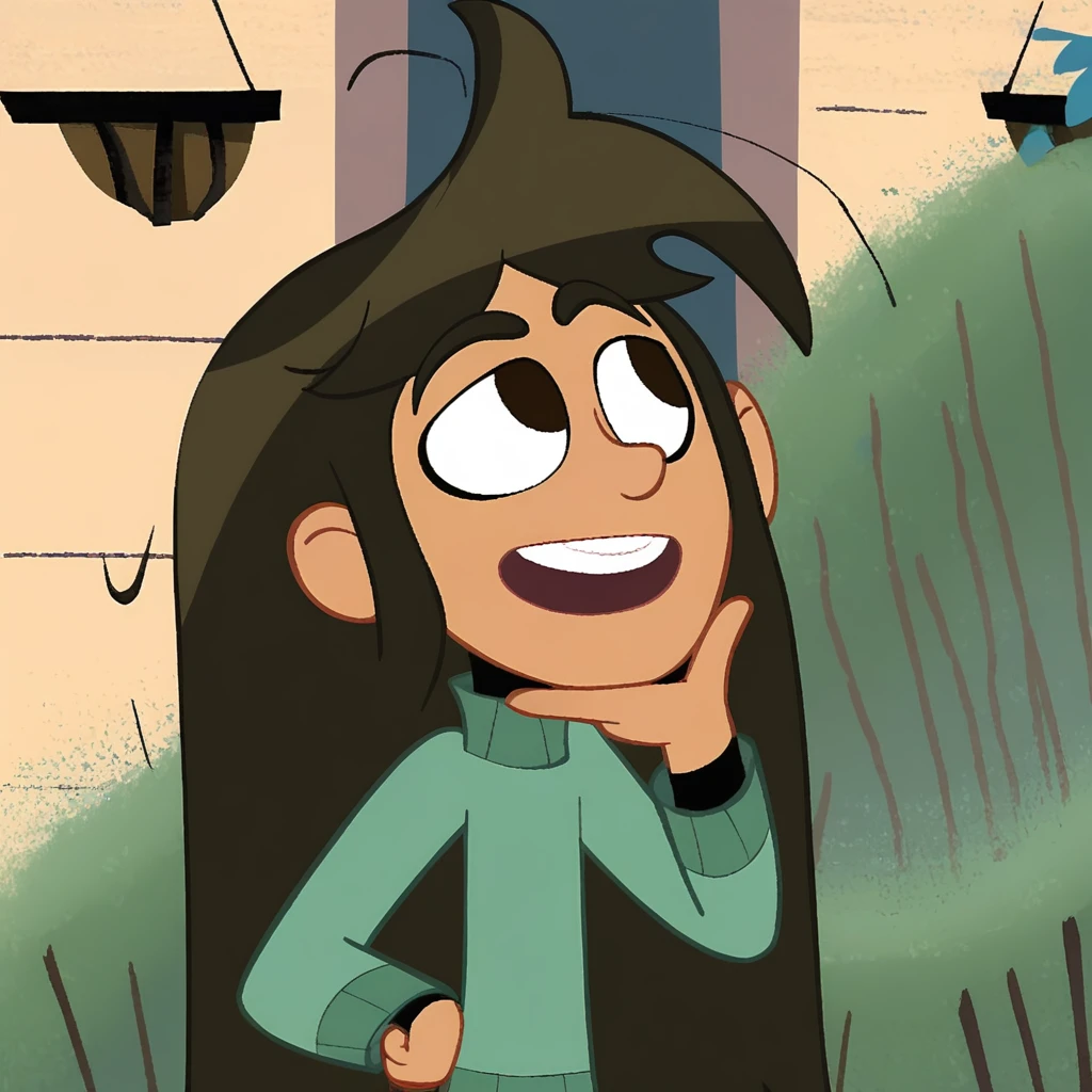 brown hair, long hair, messy hair, brown eyes, droopy eyes, green turtleneck sweater, long sleeves, tan-skinned female, beige pants, black army boots,