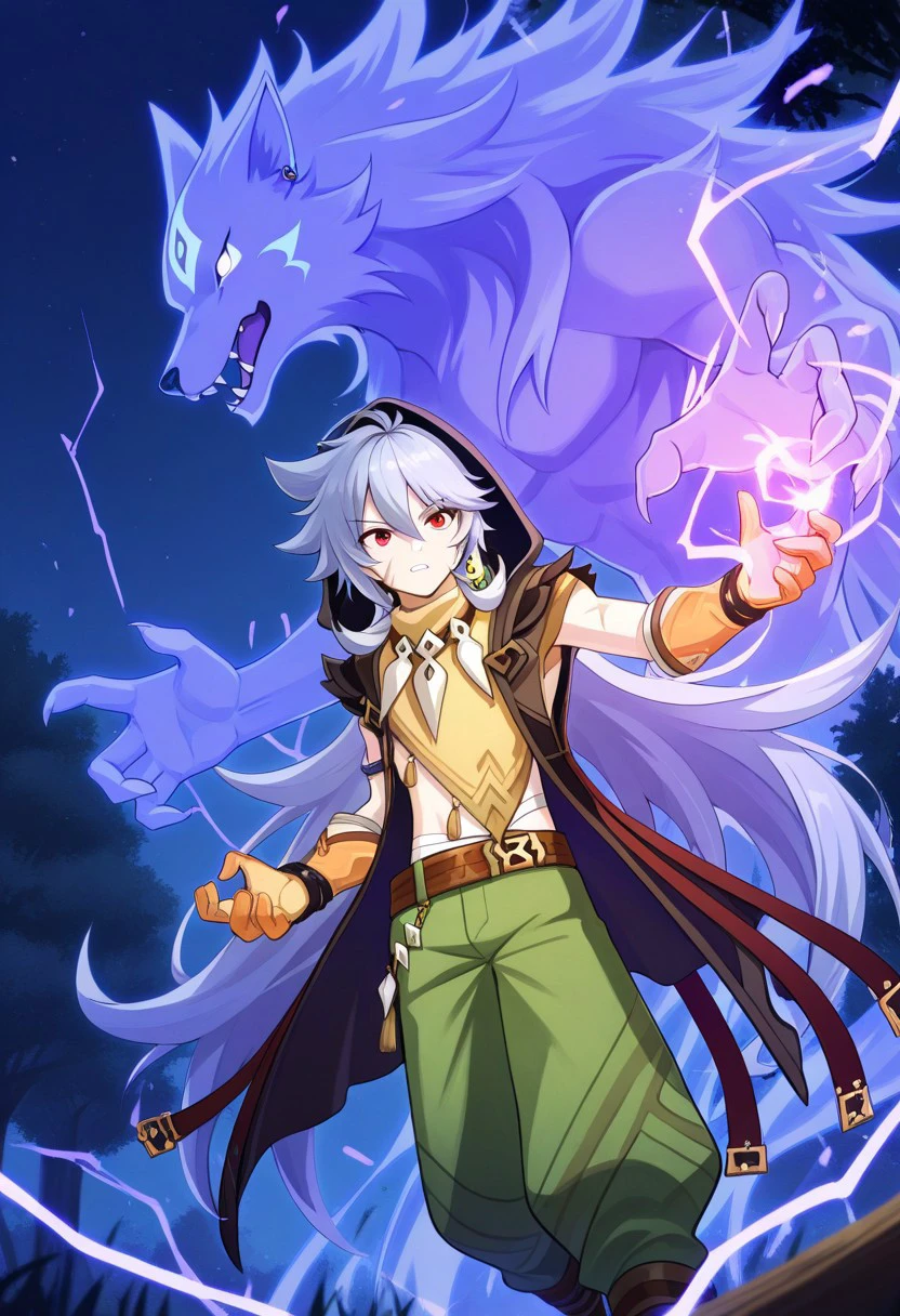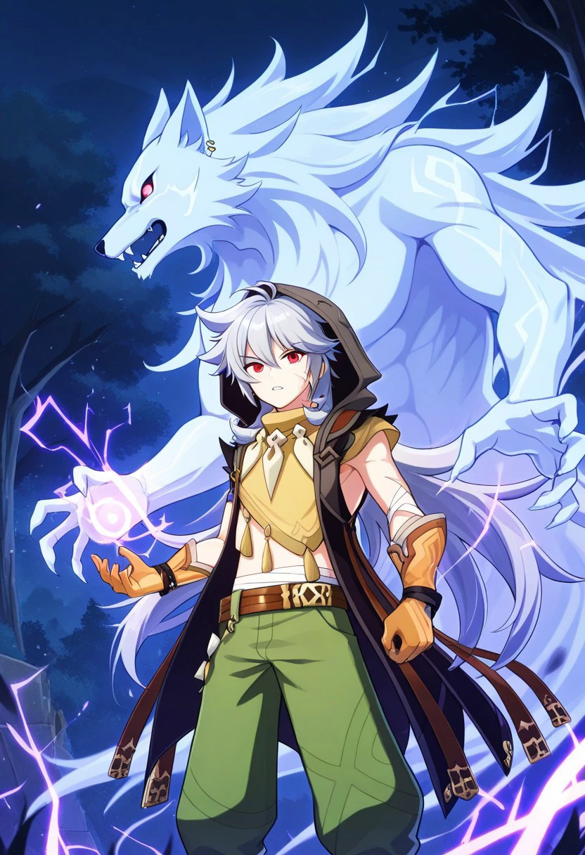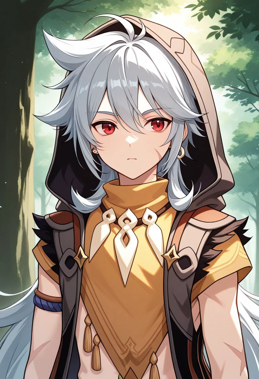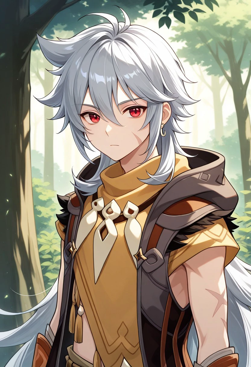 boreas, 1boy, male focus, solo, red eyes, grey hair, long hair, very long hair, bangs, hair between eyes, jewelry, earrings, single earring, tooth necklace, scar, scar on face, jacket, sleeveless jacket, brown jacket, hood, hood up, tassel, orange shirt, short sleeves, midriff, bandages, gloves, orange gloves, belt, pants, green pants, boots, black footwear,