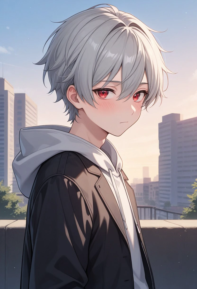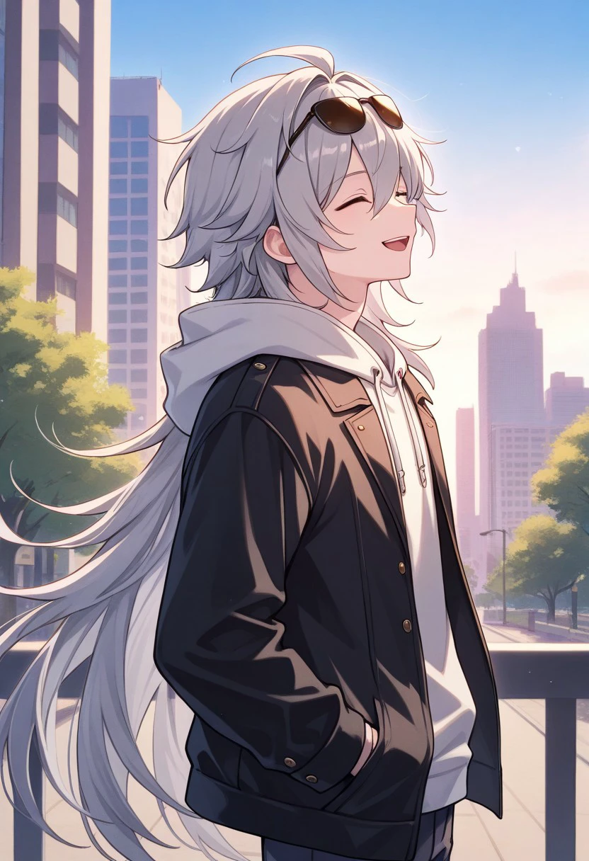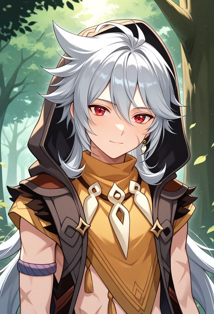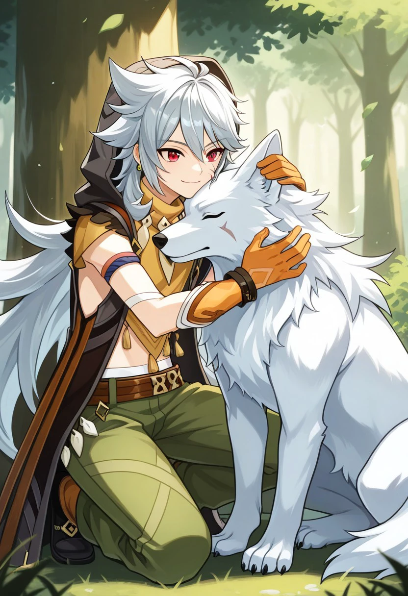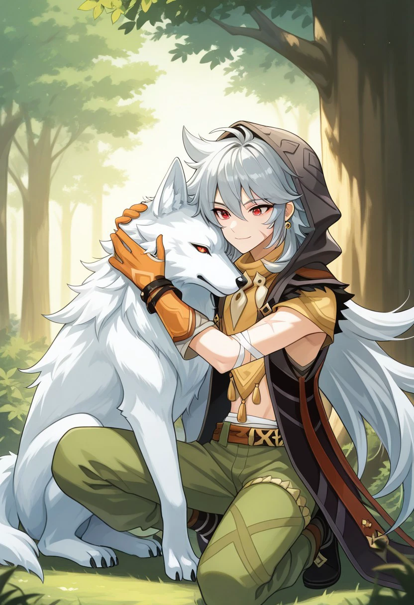 boreas, 1boy, male focus, solo, red eyes, grey hair, long hair, very long hair, bangs, hair between eyes, jewelry, earrings, single earring, tooth necklace, scar, scar on face, jacket, sleeveless jacket, brown jacket, hood, hood up, tassel, orange shirt, short sleeves, midriff, bandages, gloves, orange gloves, belt, pants, green pants, boots, black footwear,