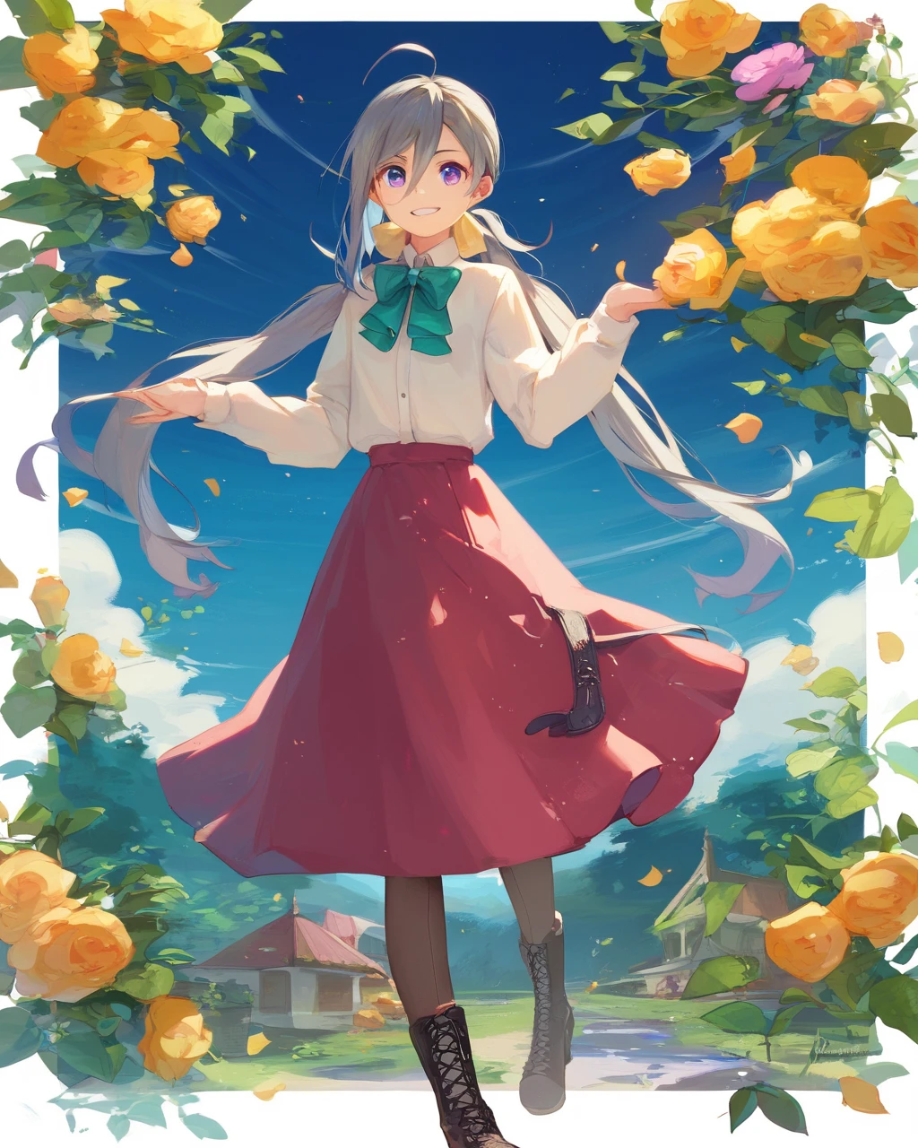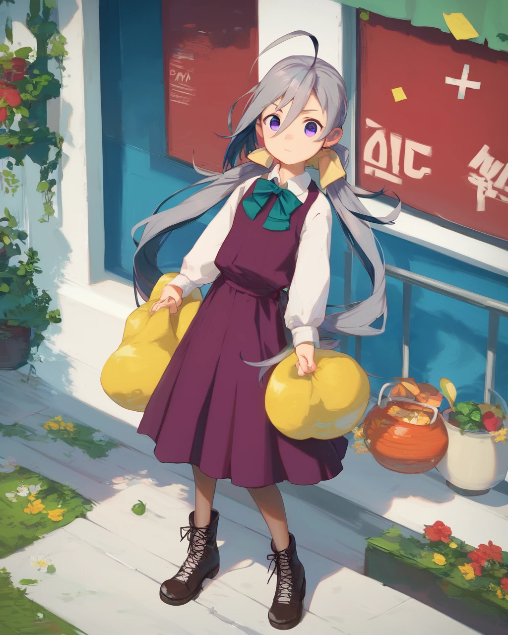 Kiyoshimopony, long_hair, grey_hair, ahoge, twintails, low_twintails, hair_between_eyes, grey_eyes, hair_bun,