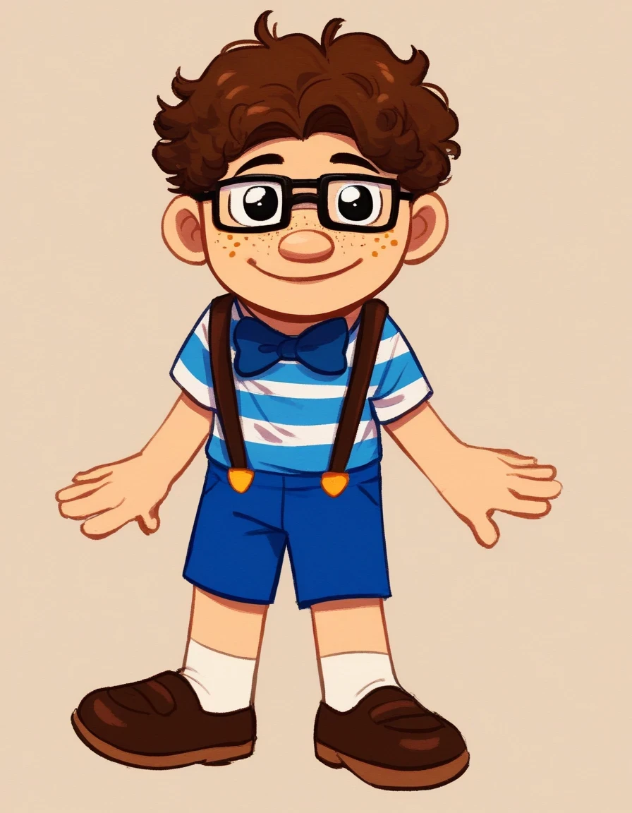 Cody_V2, shirt, brown hair, 1boy, bow, shorts, glasses, bowtie, striped clothes, plaid shirt, blue shorts, striped shirt, blue bowtie, freckles, brown shoes, brown suspenders, black glasses, black eyes