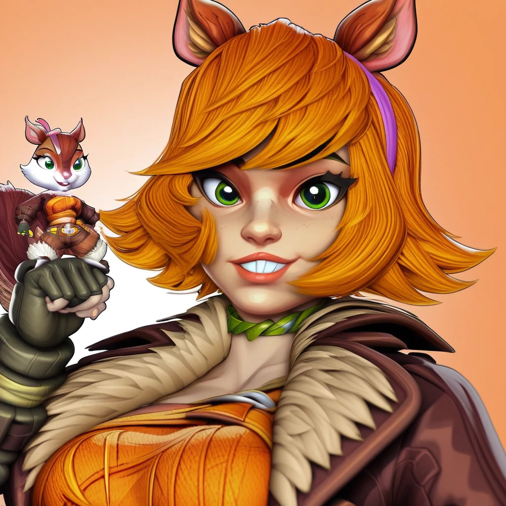 Doreen, 1girl, slightly chubby, green eyes, buck teeth, short orange hair, hairband, squirrel ears on hairband, big bushy squirrel tail, green choker, brown jacket, long sleeves, black fingerless gloves, brown undershirt, exposed midriff, belt, booty shorts, black knee high socks, brown boots,