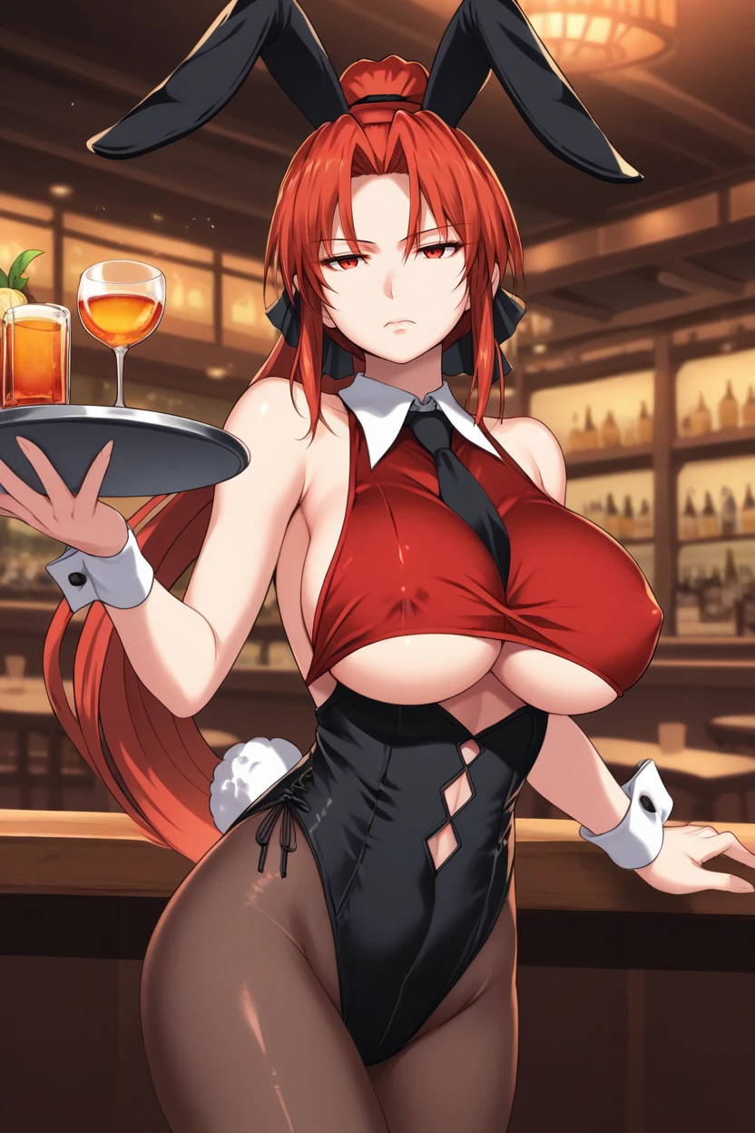Bunny waitress: black bunnysuit, red top, shirt collar, necktie, sleeveless, covered ????? ???????, underboob, wrist cuffs, pantyhose,