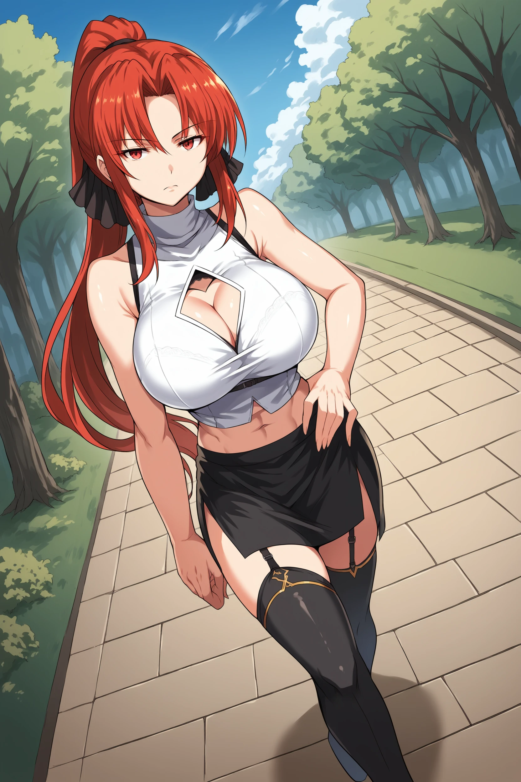 Casual outfit: white sleeveless turtleneck, cleavage cutout, bare shoulders, midriff, miniskirt, black skirt, garter straps, belt, side slit, black thighhighs,