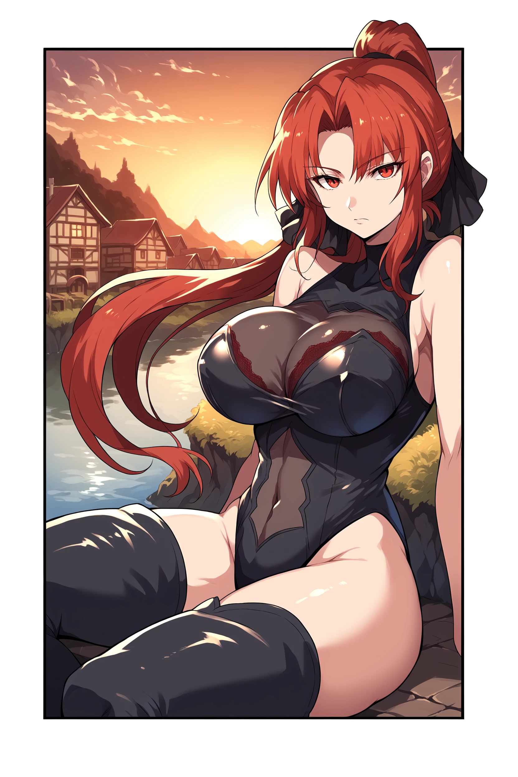 Leotard: black leotard, covered navel, covered cleavage window, sleeveless, thigh boots, highleg leotard, skin tight, lace trim,