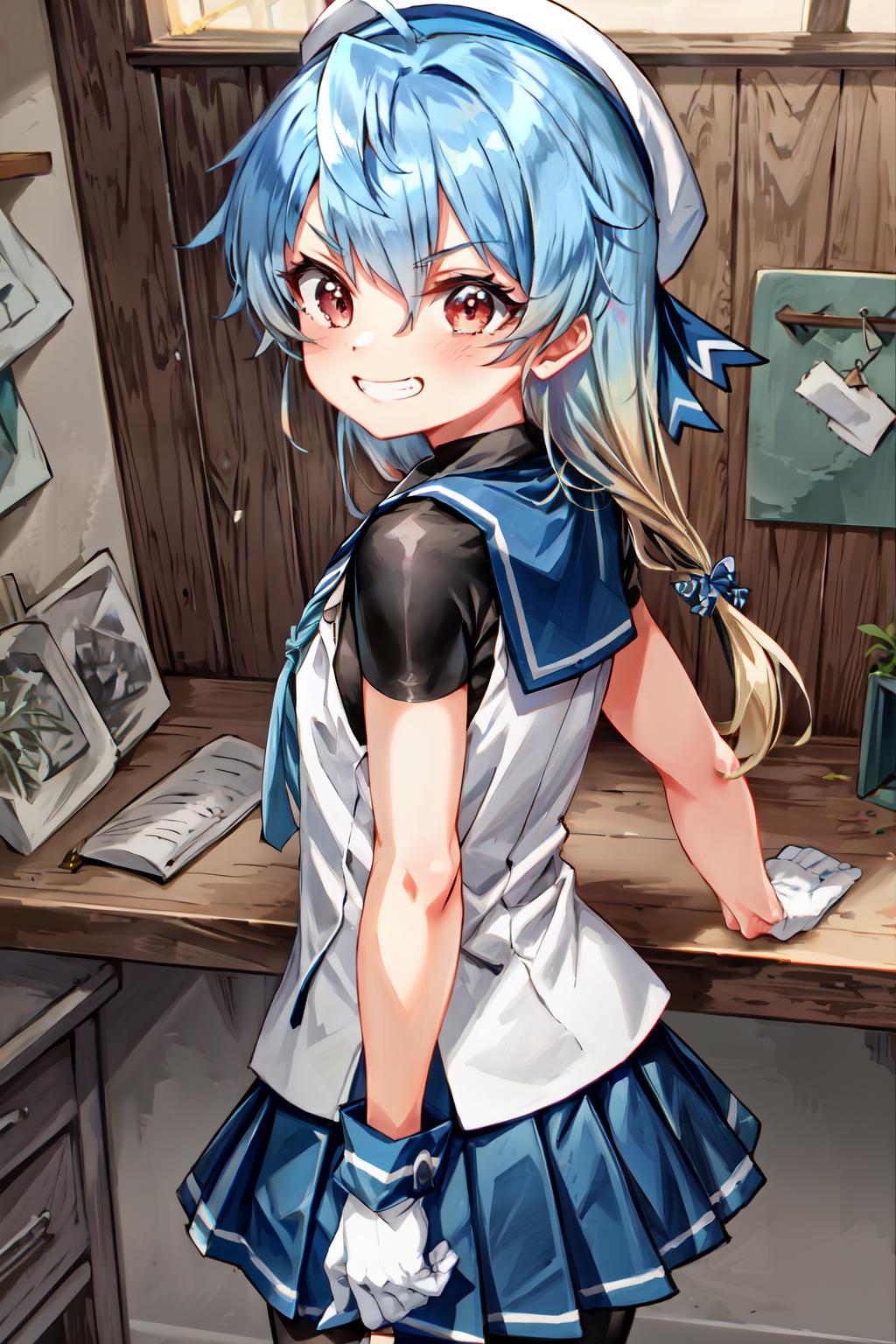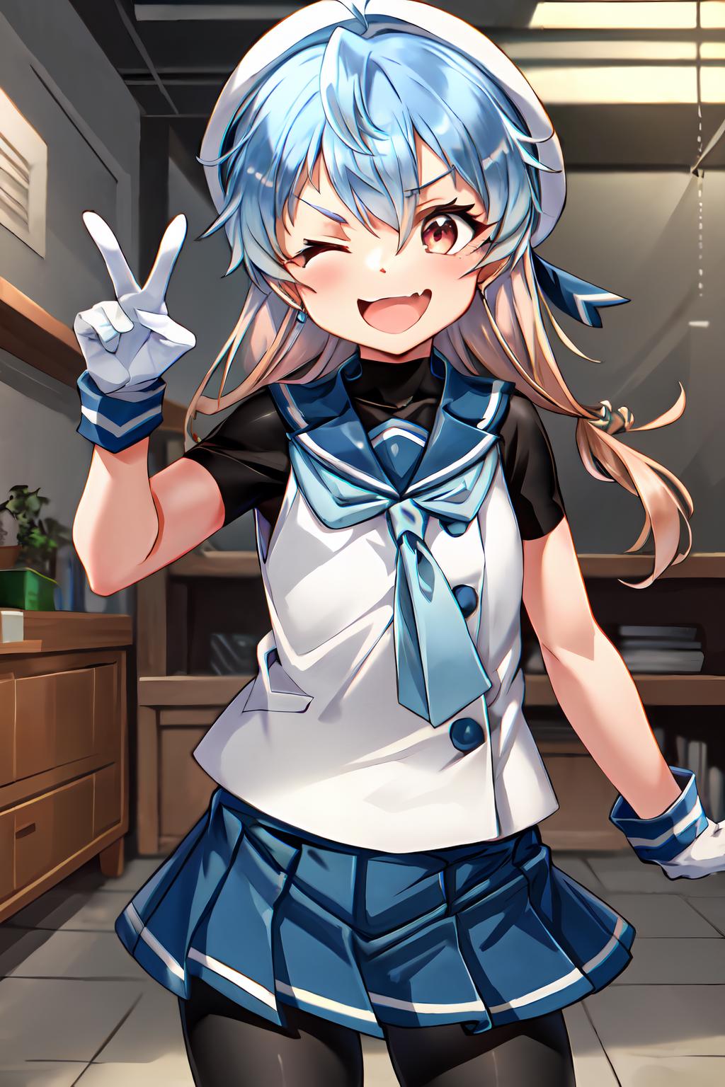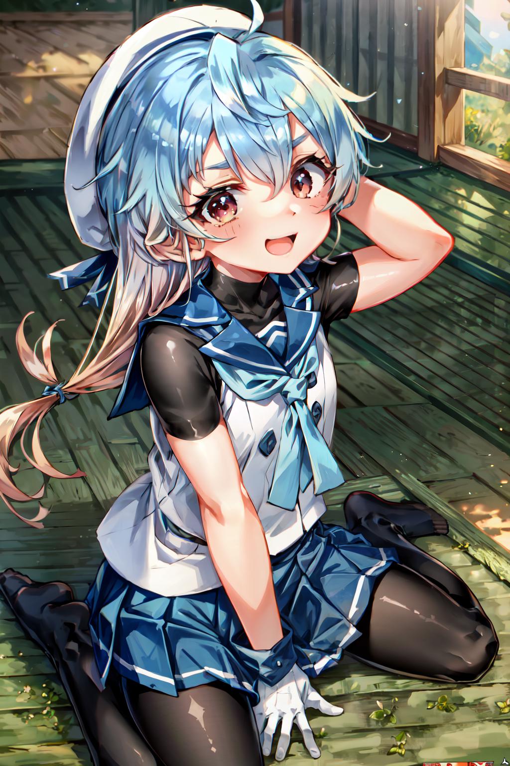 SadoKC, long hair, sailor hat, white headwear, sleeveless shirt, undershirt, blue sailor collar, blue pleated skirt, black pantyhose, white gloves, blue ribbonSome additional tags that you may use for reference