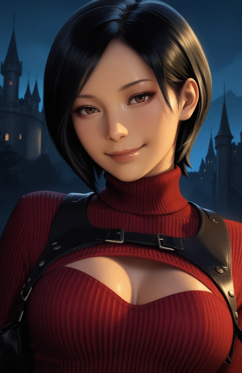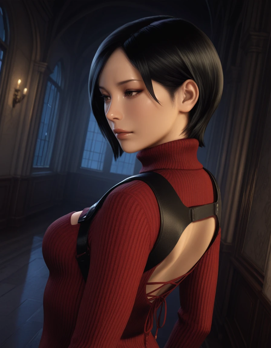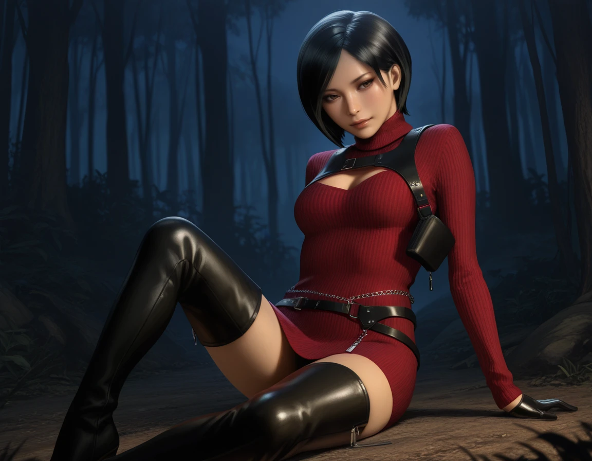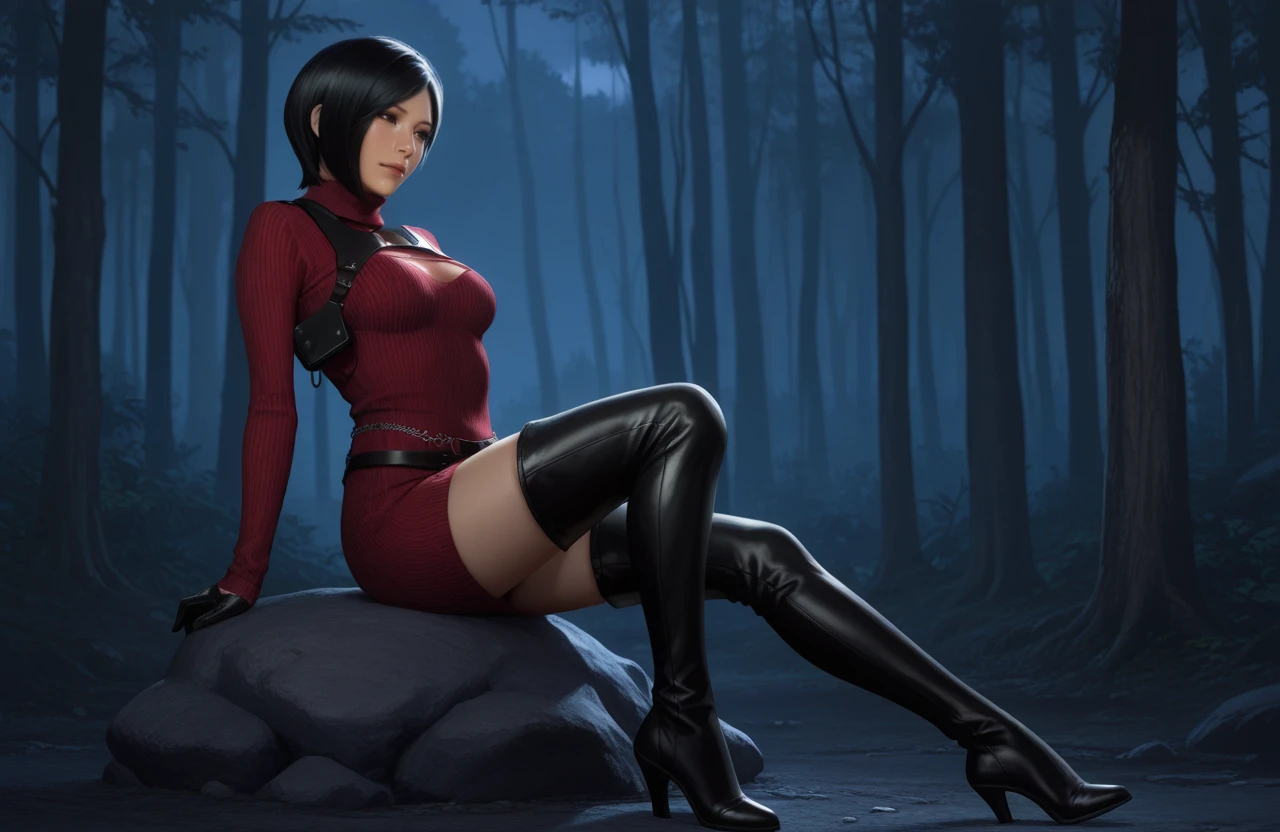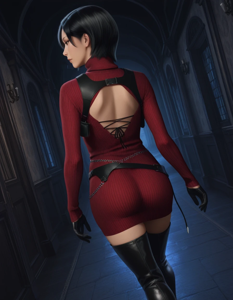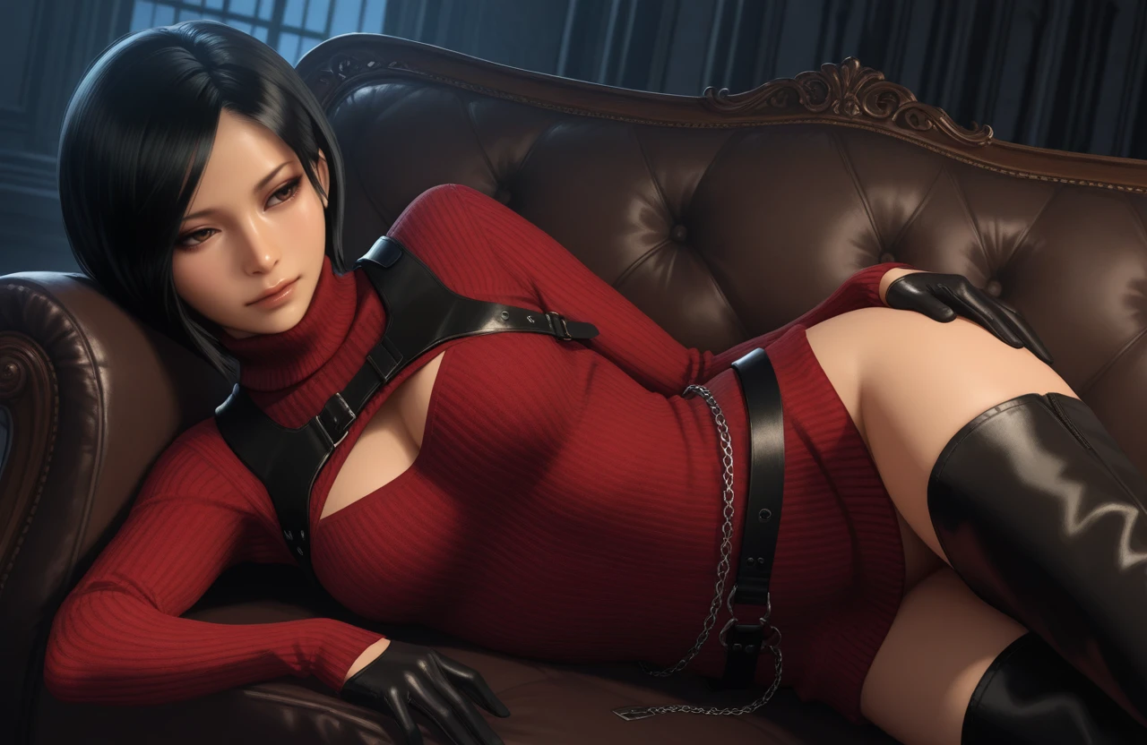 • Positive prompt for default outfit: 1girl, ada wong, short hair, black hair, brown eyes, breasts, sweater, turtleneck, clothing cutout, gloves, chain, jewelry, belt, dress, thighhighs, thigh boots