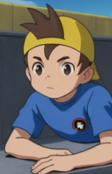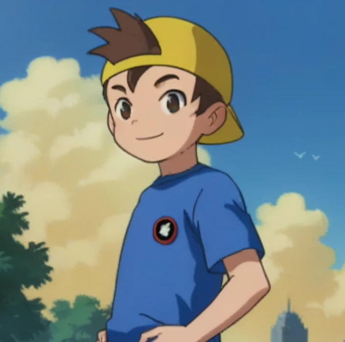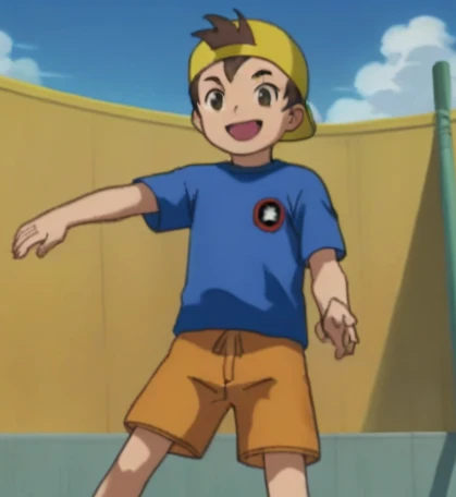 Prompts: male, brown hair, brown eyes, blue t-shirt, blue print shirt, orange shorts, yellow baseball cap, backwards hat, blue shoes