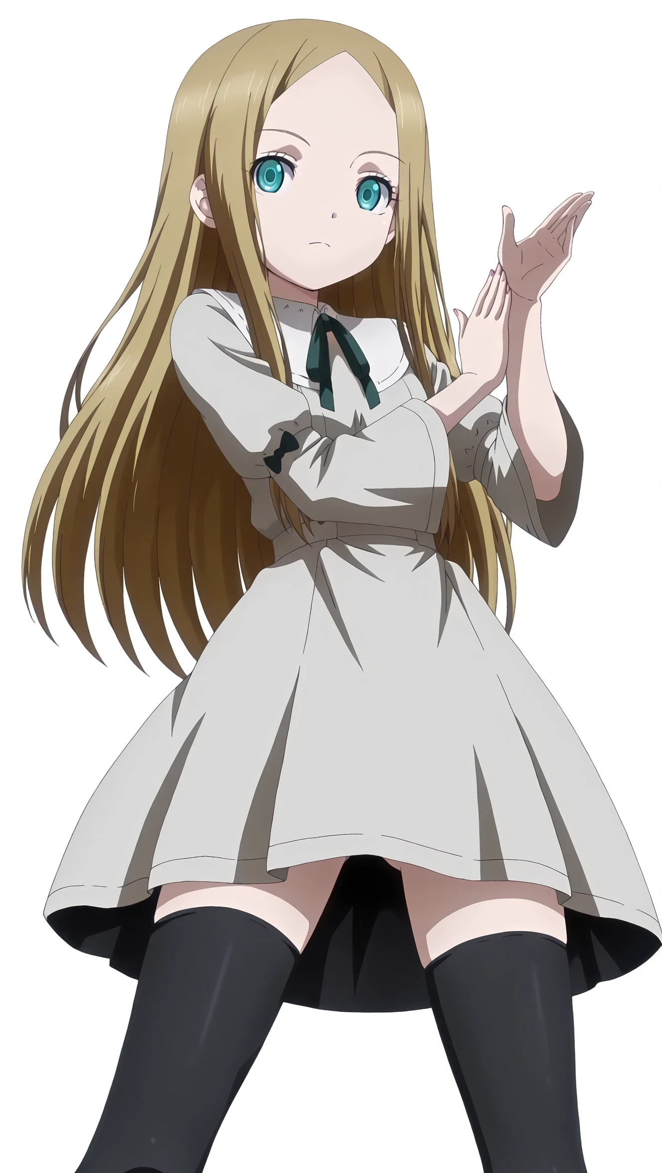 nina, 1girl, petite, long hair, blonde hair, aqua eyes, very small breasts, green neck ribbon, thighhighs, dress, black thighhighs