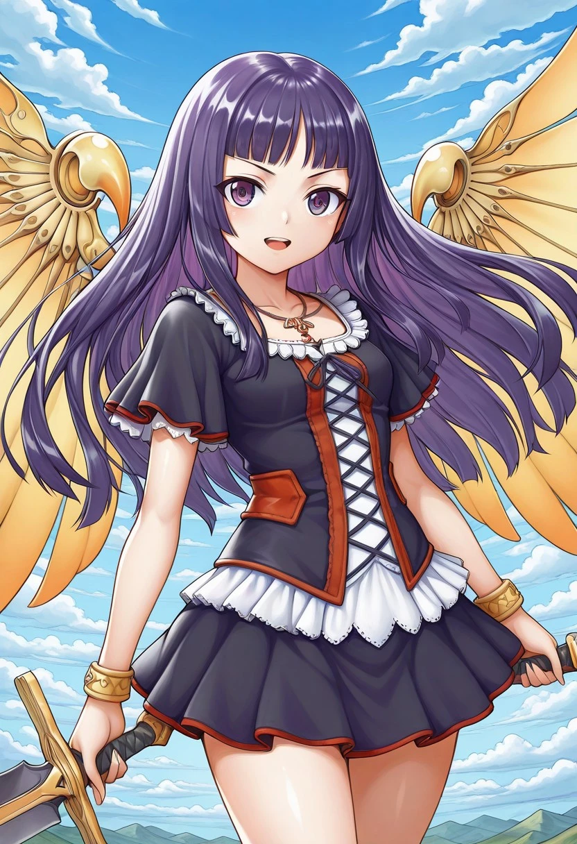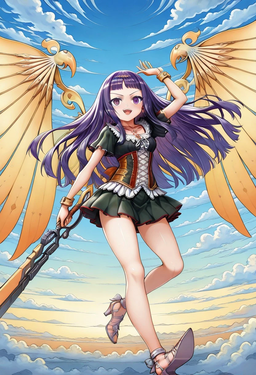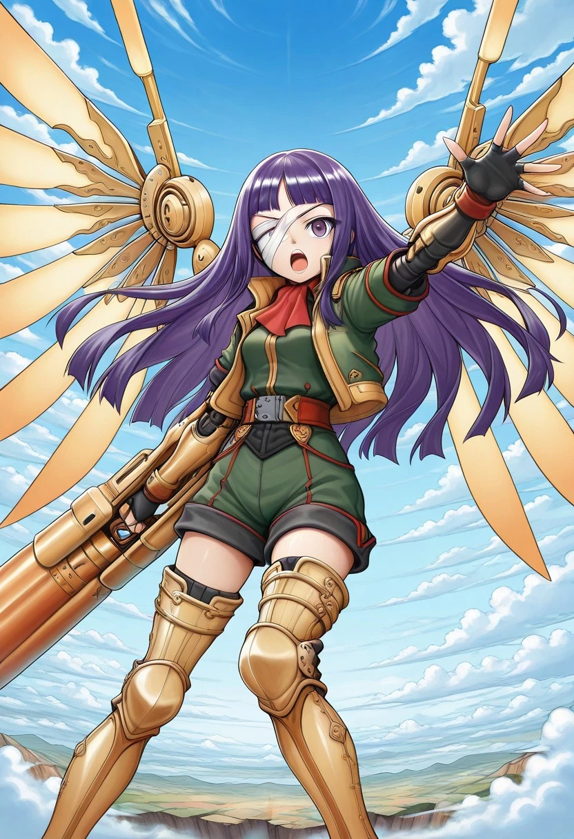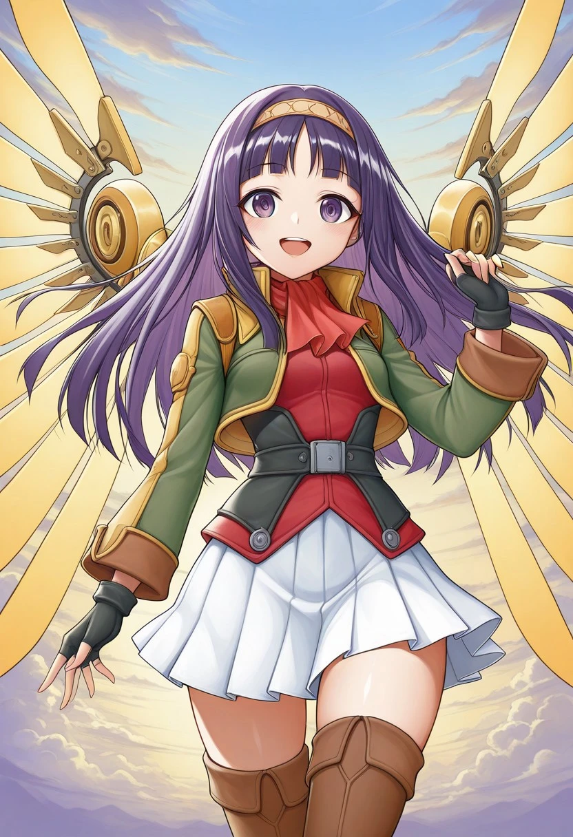 red Jabot, fingerless gloves,zettai ryouiki,hairband,white skirt,zettai ryouiki,long sleeves,brown thighhighs,green jacket,black breastplate, waist skirt, mechanical wings,yellow wings,