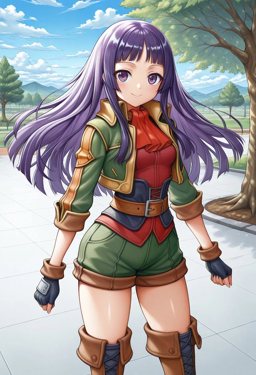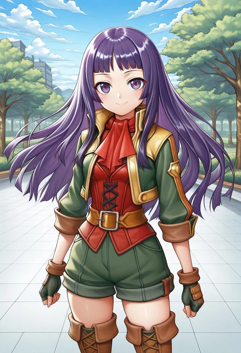 red Jabot,belt,fingerless gloves,green shorts,thigh boots,zettai ryouiki,green jacket,