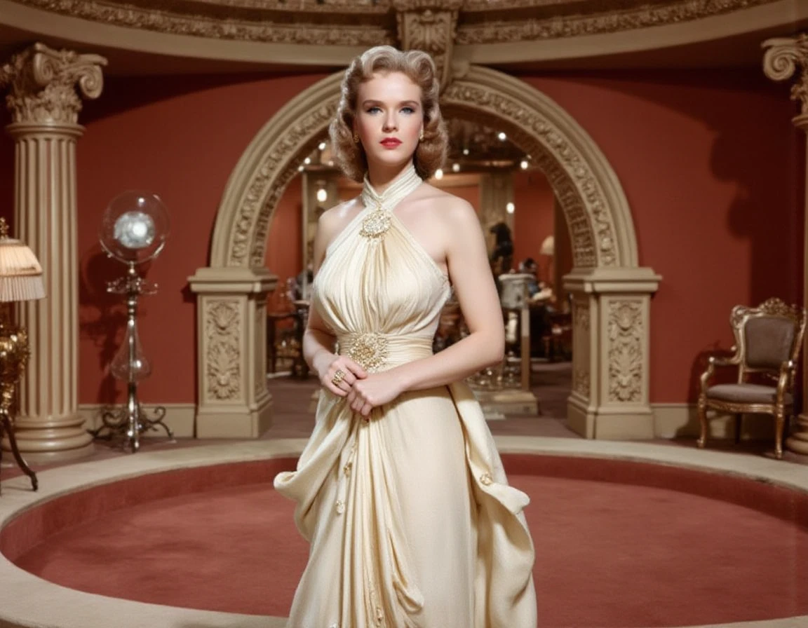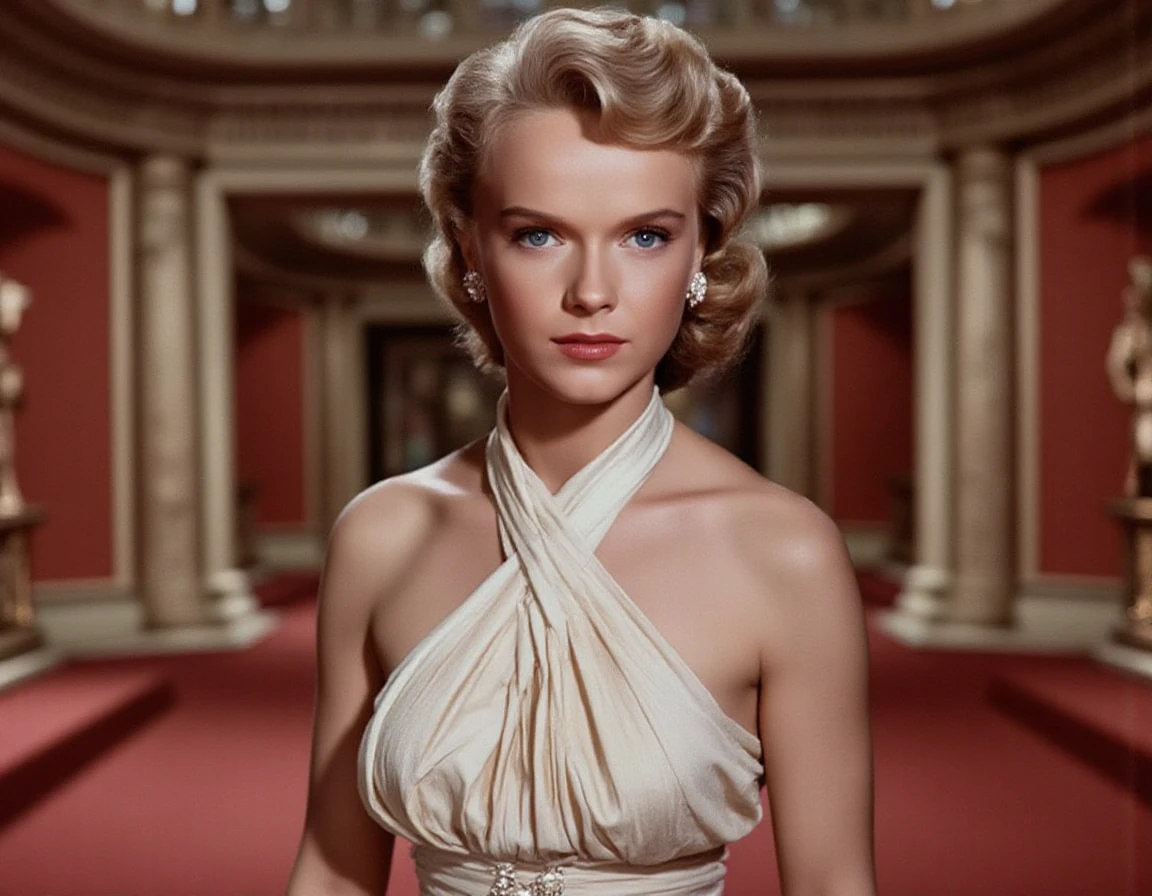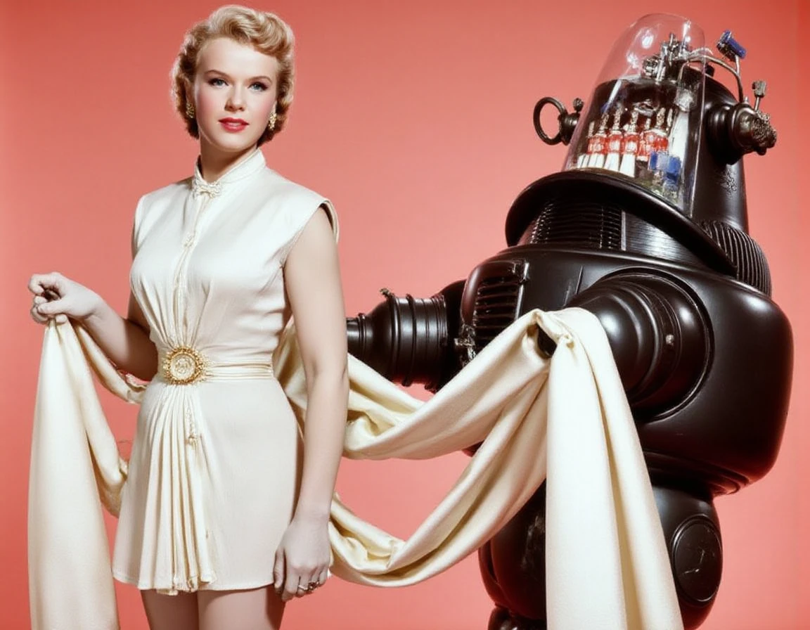 Anne Francis as Altaira Morbius in Forbidden Planet. Add Robbie the Robot to prompts for the world famous tin man.