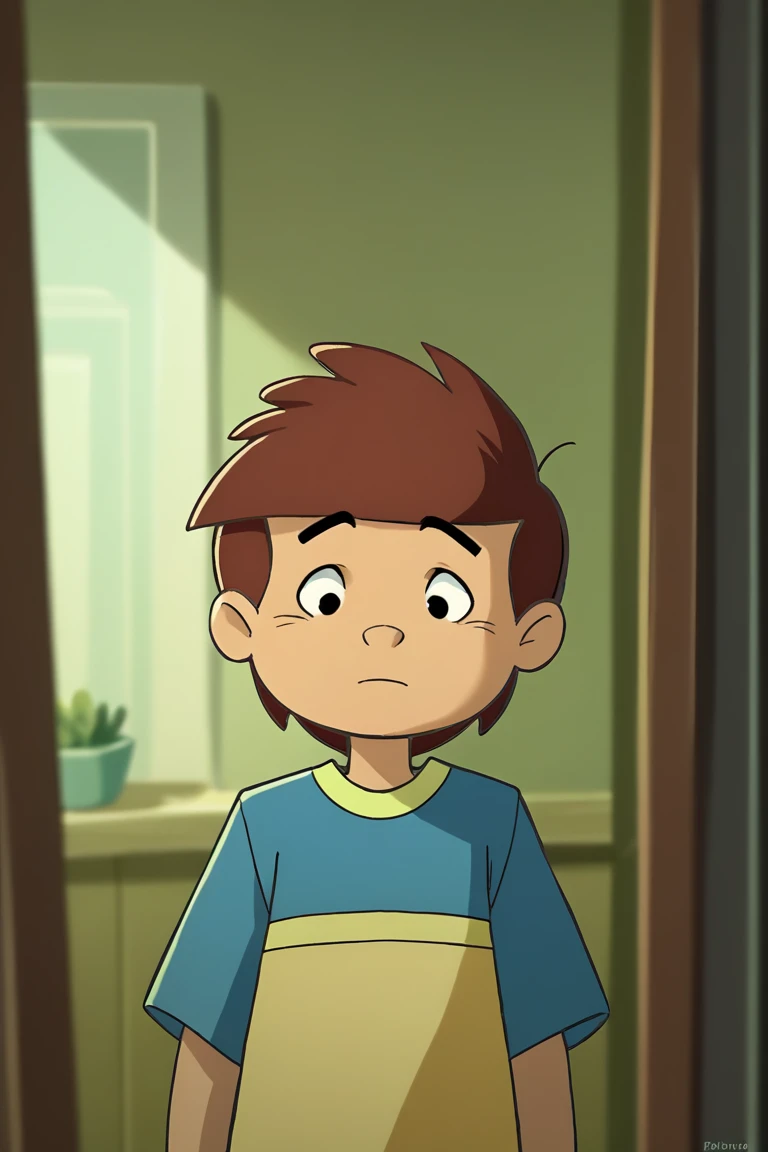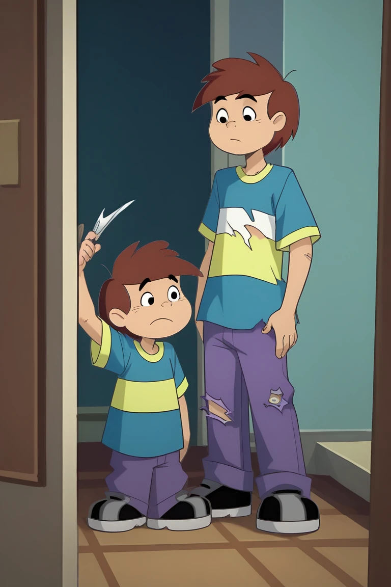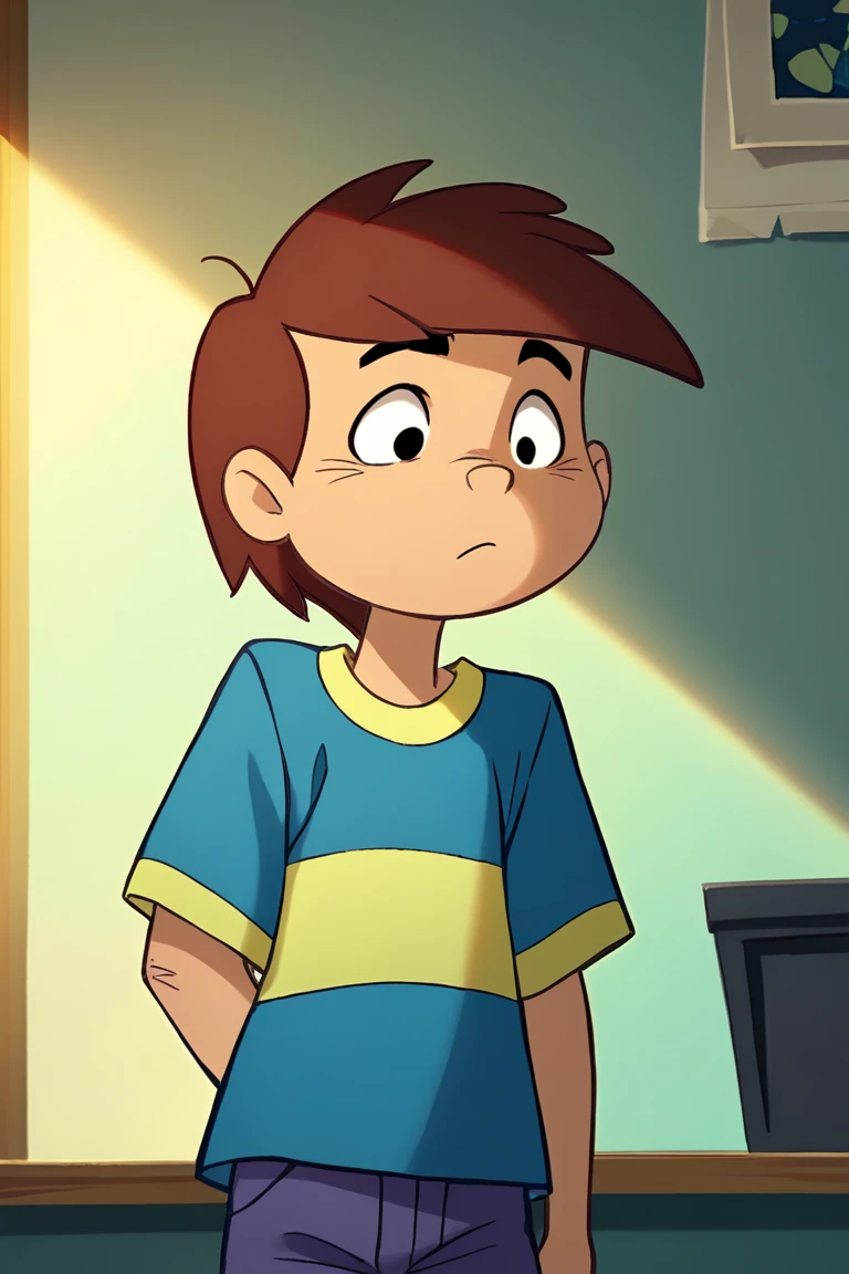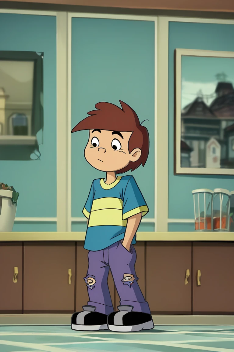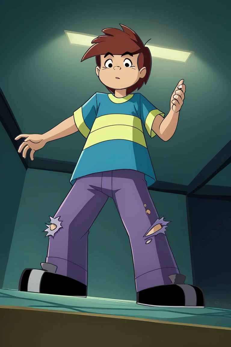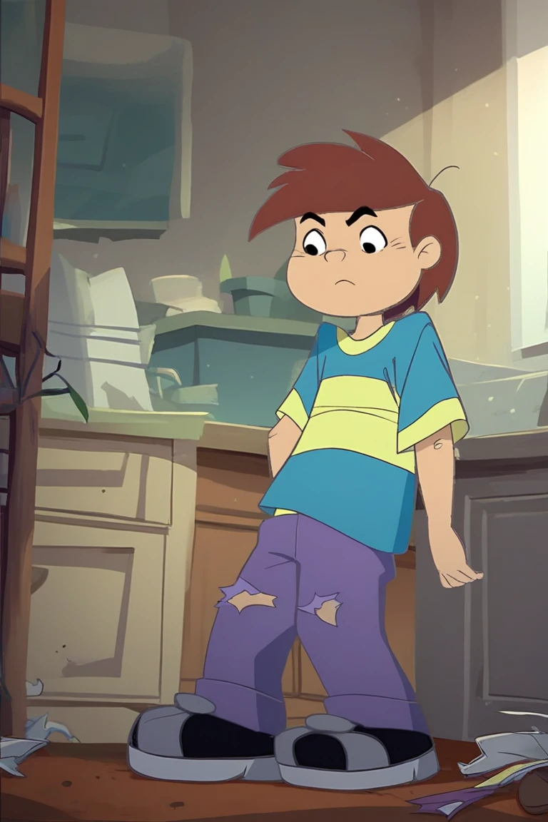 Trained tags: kevin_whitney, 1boy, brown hair, striped shirt, shoes, torn clothes, pants, black eyes, (Remove shoes and pants to have medium shots or close ups)