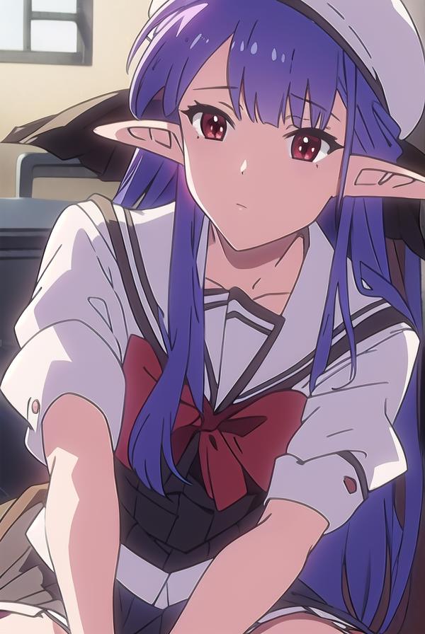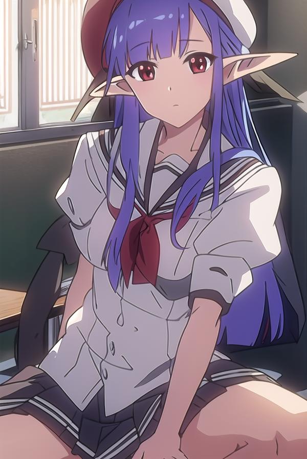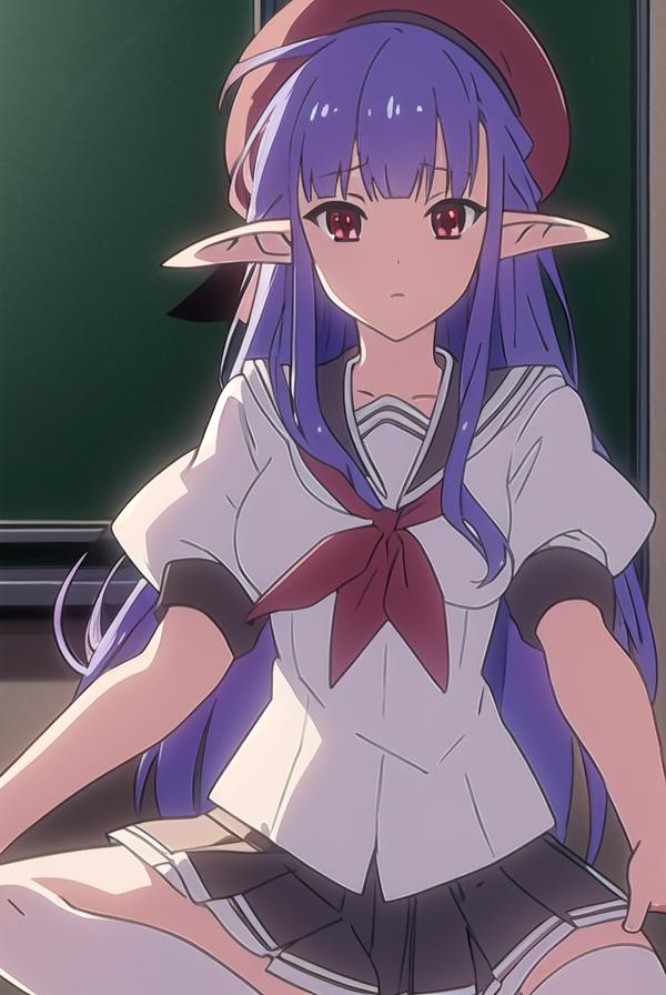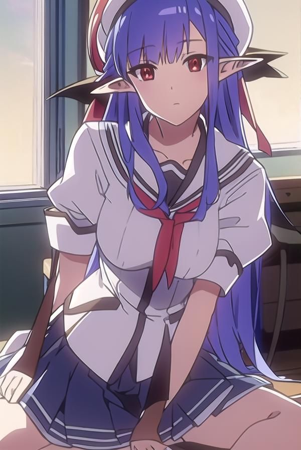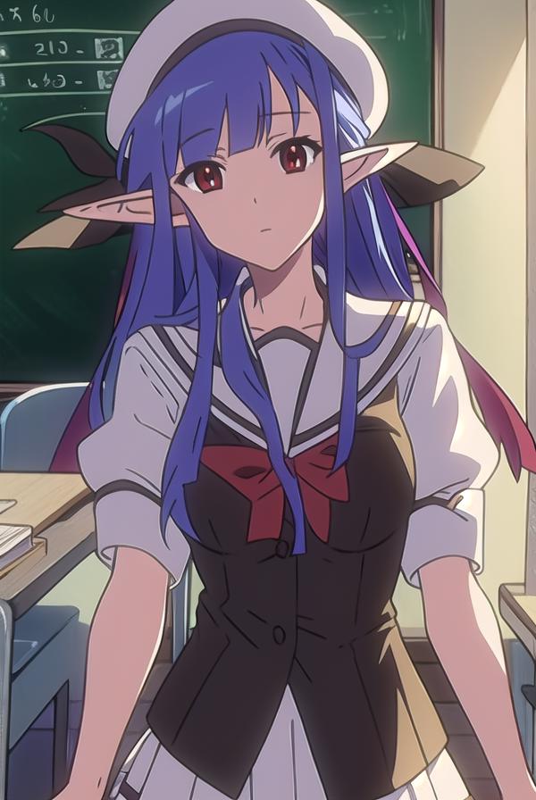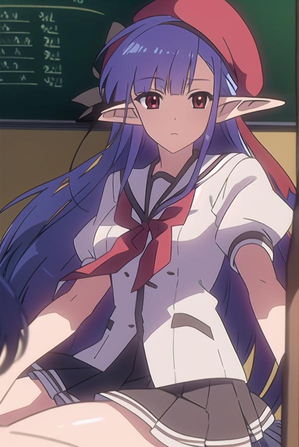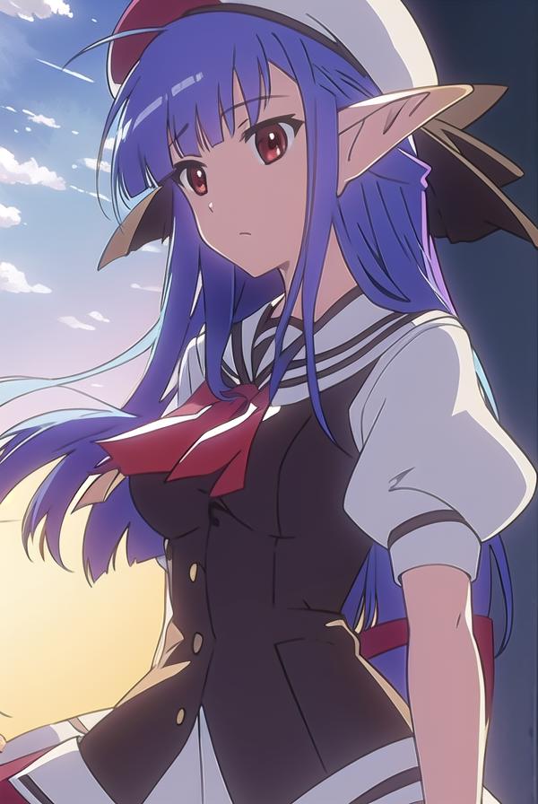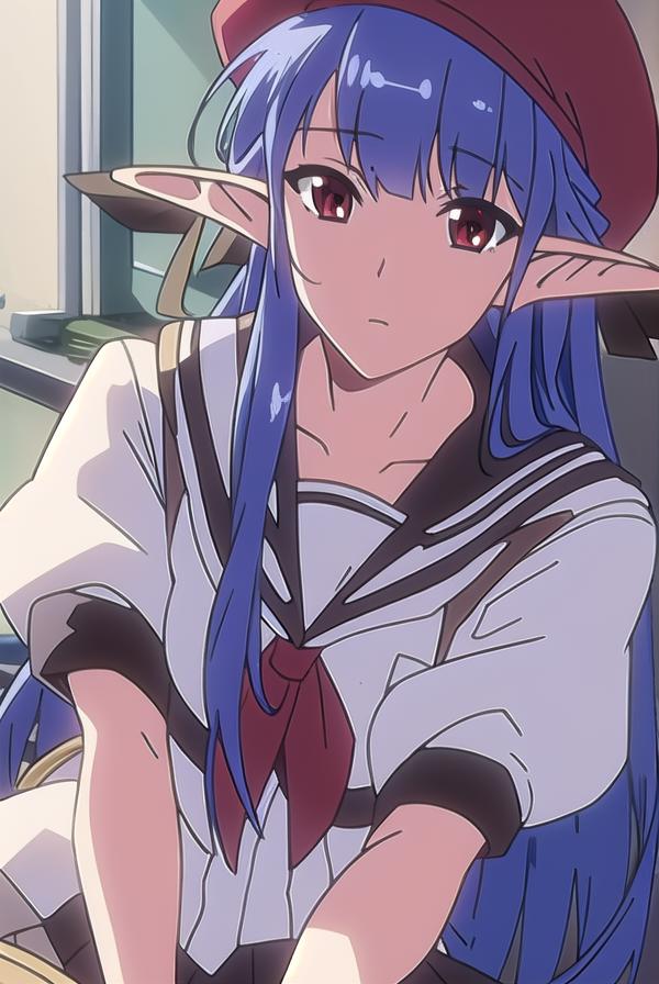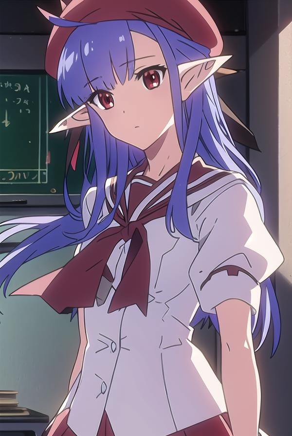 nerine, long hair, blue hair, pointy ears, (red eyes:1.5),