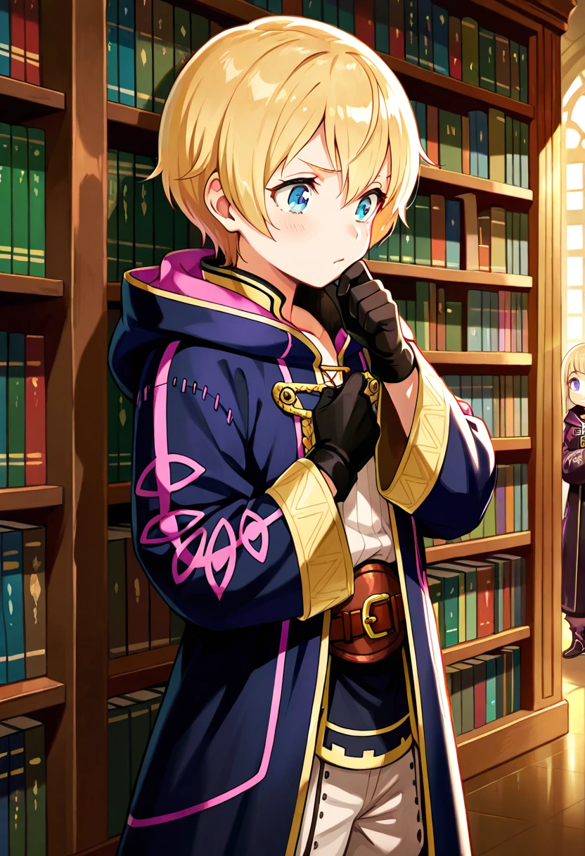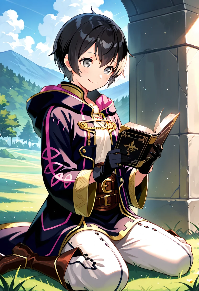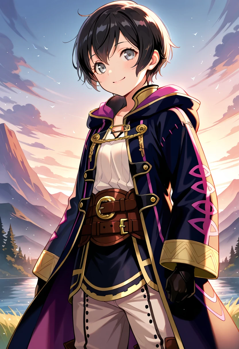 mmorgan_sdxl, black hair, grey eyes , short hair,robe, black gloves, hood down, belt, pants, boots