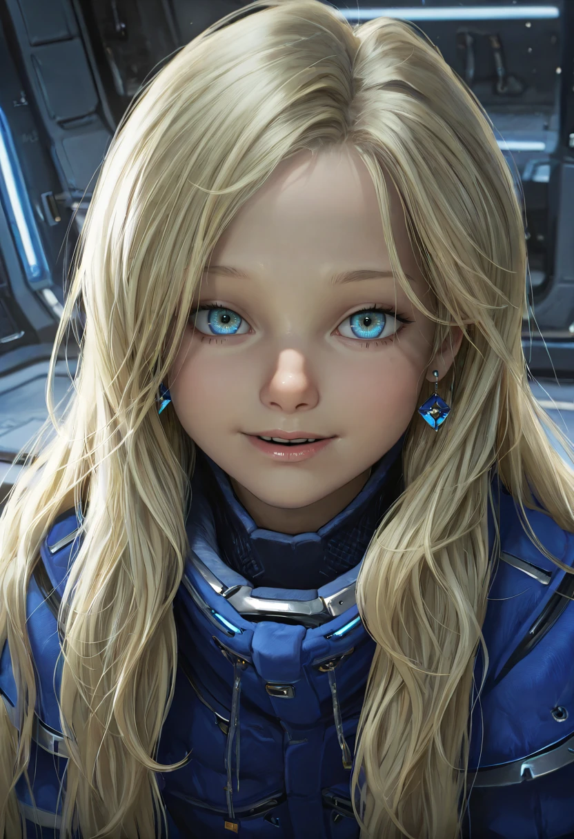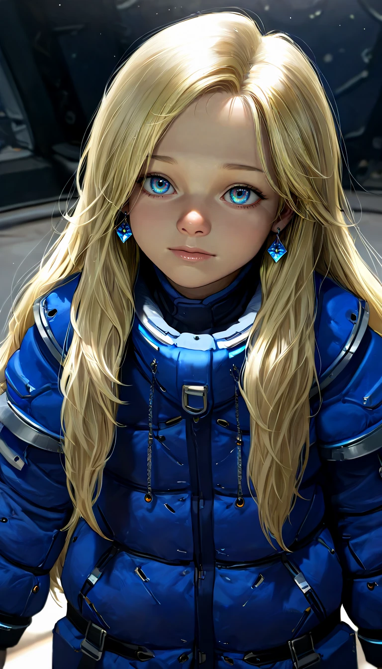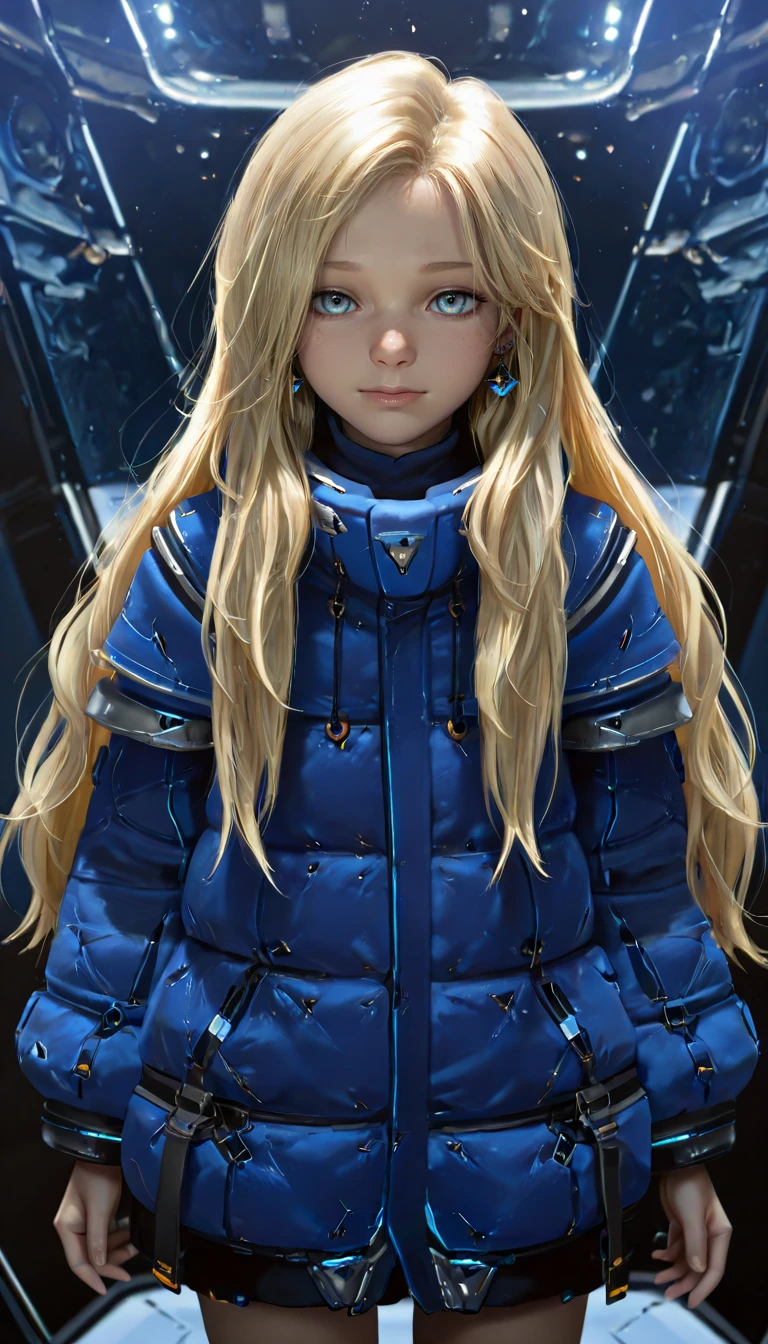 pdiana, 1girl, long hair, blonde hair, blue eyes, multicolored eyes, brownish ring pupils, young girl, blue coat, realistic,