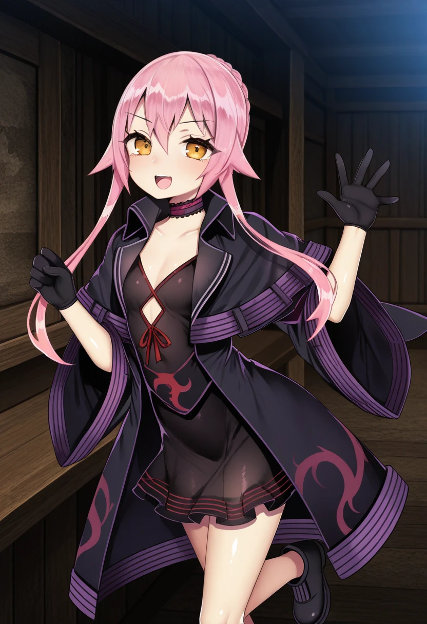 black dress, wide sleeves, choker, black gloves, black footwear