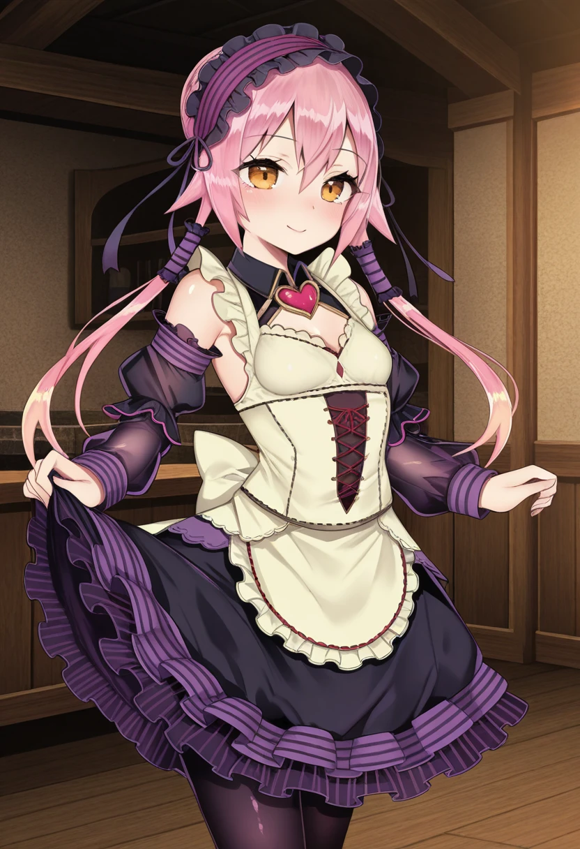 frilled dress, lolita fashion, frilled apron, detached sleeves, frilled hairband, black pantyhose,