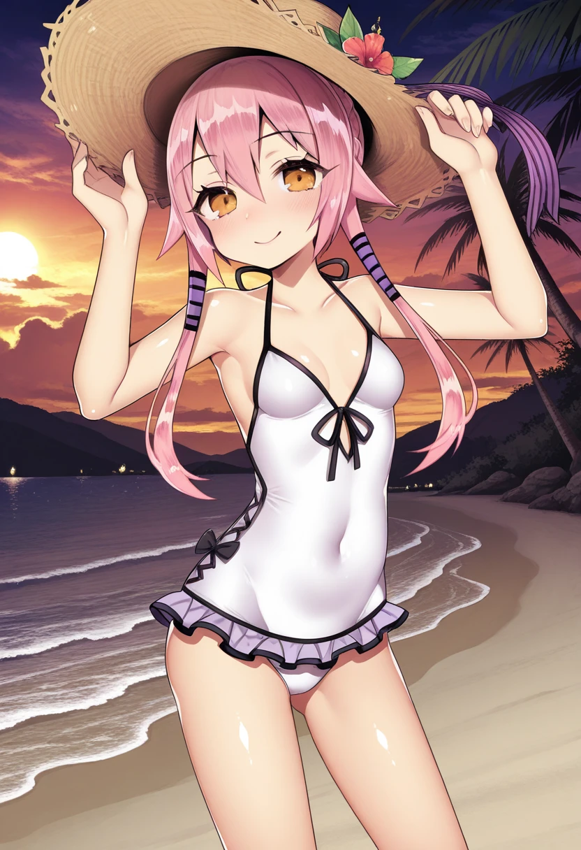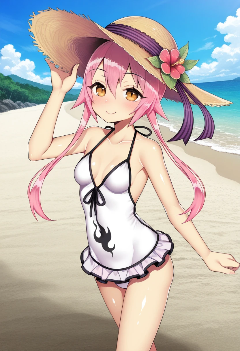 casual one-piece swimsuit, white one-piece swimsuit, hat,