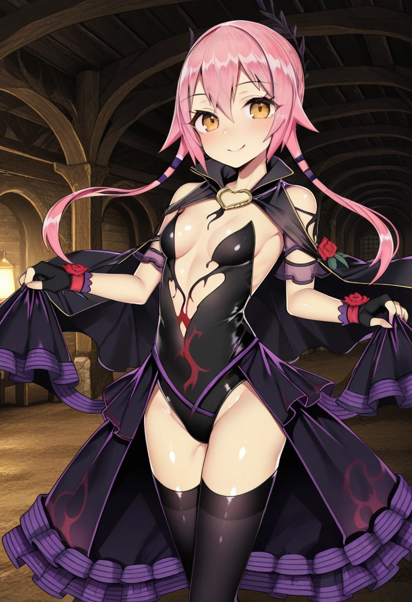 black leotard, strapless leotard, center opening, revealing clothes, bare shoulders, black cape, frills, rose, fingerless gloves, black thighhighs, showgirl skirt
