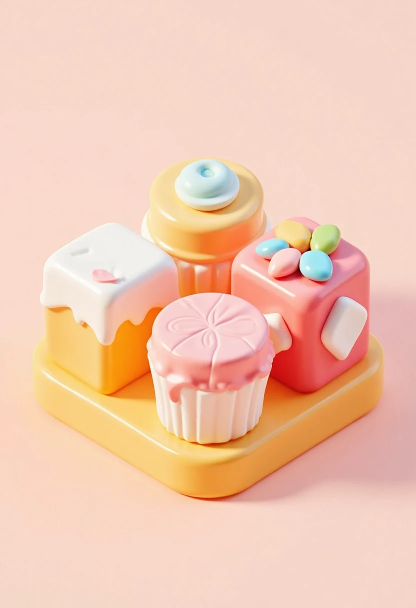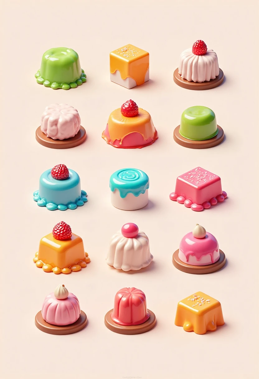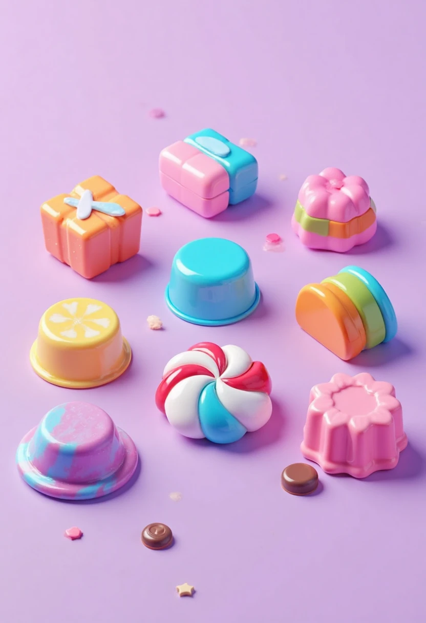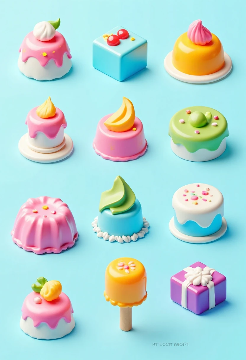Cute candy - themed 3D icons, vibrant colors, smooth surfaces, arranged on a pastel - blue backdrop, each with tiny sprinkles detail.