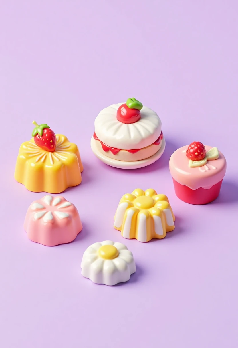 Cute candy - themed 3D icons, metallic - like sheens, assorted fruit - inspired forms, laid on a lavender ground, with strawberry - top touches.