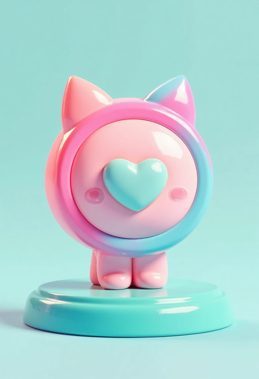 Cute candy - themed 3D icons, neon - tinted edges, whimsical animal - shaped, placed on a teal stand, featuring candy - heart eyes.
