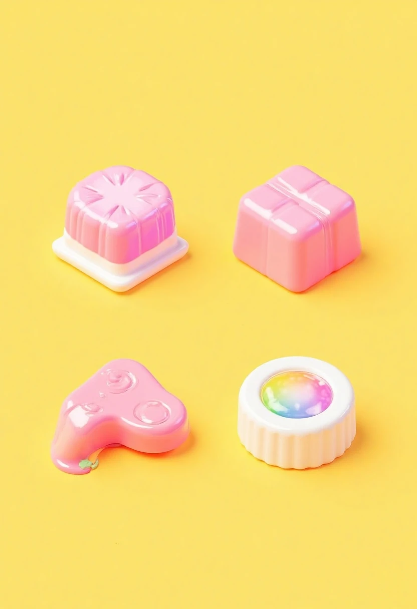 Cute candy - themed 3D icons, transparent elements, classic round and square shapes, on a yellow stage, having jelly - like fillings.