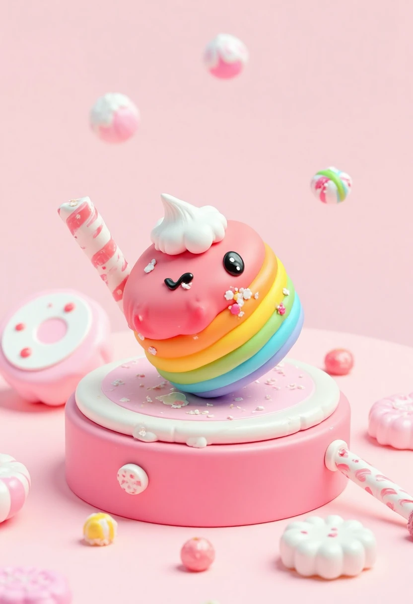 Cute candy - themed 3D icons, matte textures, bright rainbow hues, placed on a pink platform, featuring little candy - cane accents.