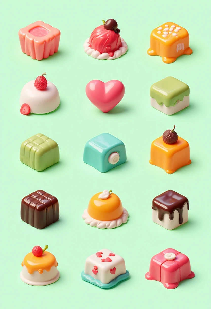 Cute candy - themed 3D icons, glossy finishes, diverse shapes like hearts and squares, set on a soft - green base, some with chocolate drips.
