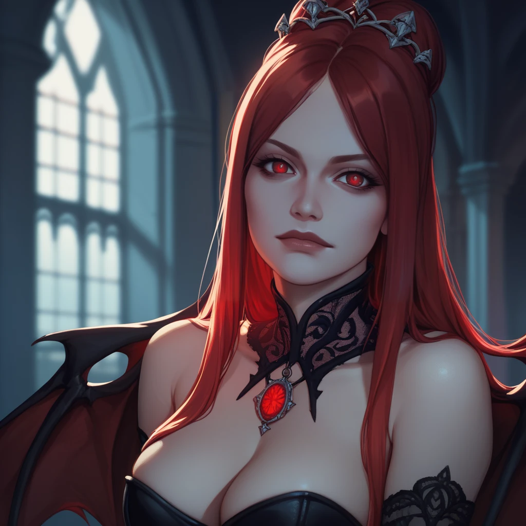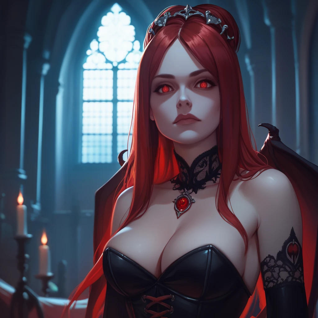 Positive prompt for the SOTN-accurate design: 1girl, CVSuccubus, red hair, hair ornament, red eyes, corset, large breasts, bridal gauntlets, ???????, demon wings, bra, choker, no panties, ??????, boots