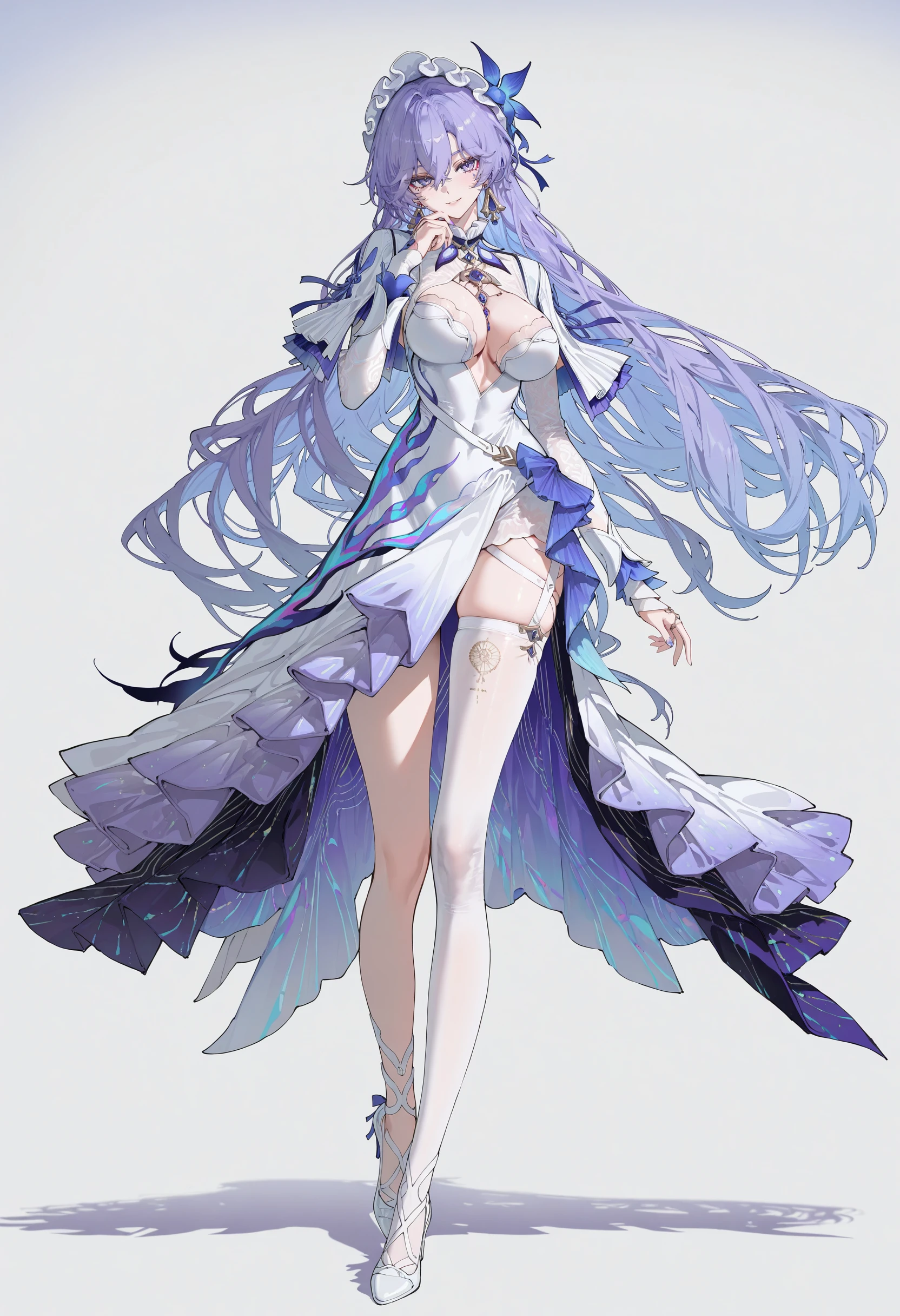 cantarella \(wuthering waves\),1girl,solo,breasts,long hair,high heels,dress,facial mark,white thighhighs,white dress,thighhighs,single thighhigh,large breasts,purple eyes,hair ornament,purple hair,cleavage,white footwear,