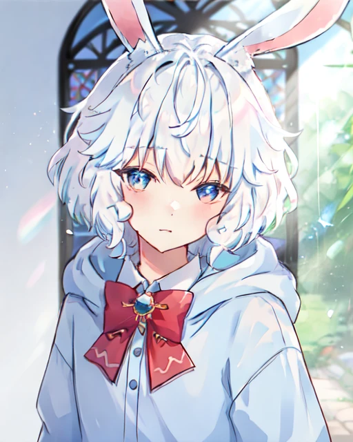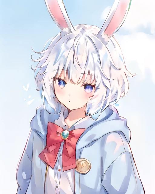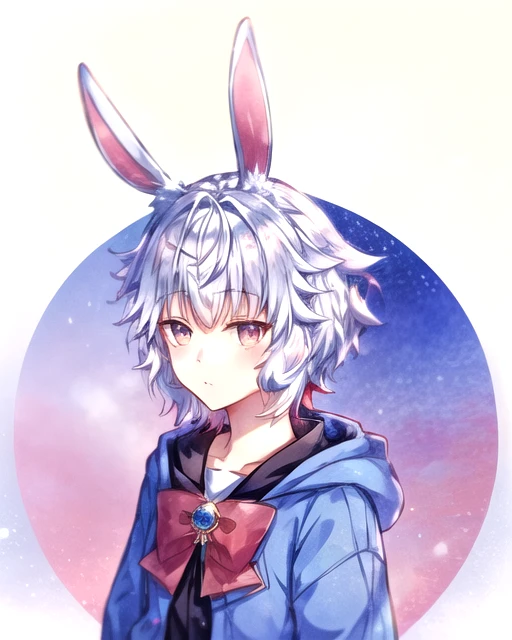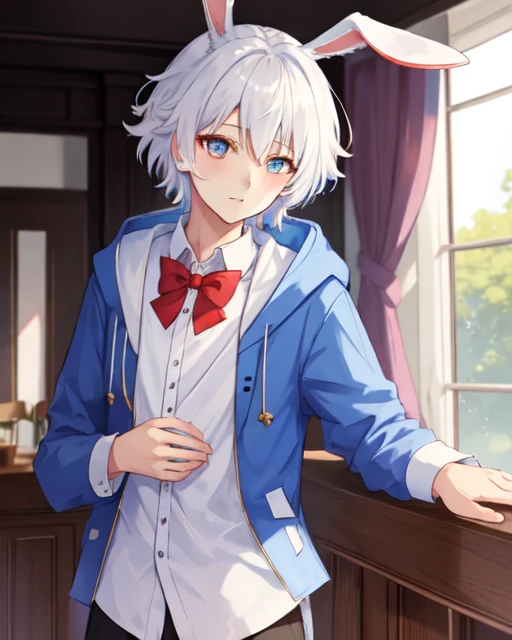 Khyo, 1 boy, white hair, bunny ears, blue jacket, red bowtie