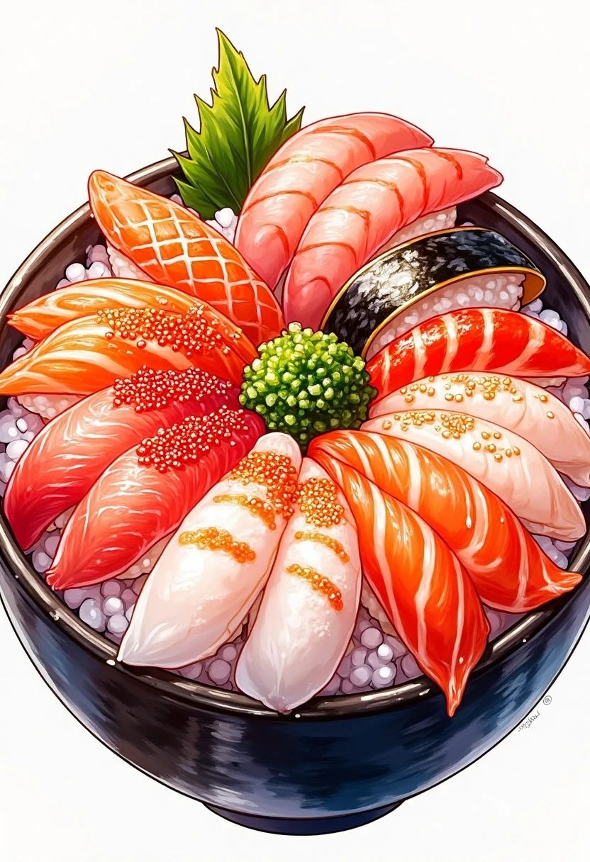 Food illustration style, vibrant sushi bowl, assorted fresh sashimi, glistening fish roe, neatly arranged, bright color palette.