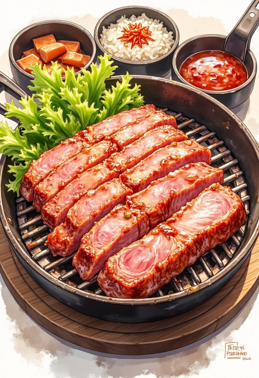 Food illustration style, Korean barbecue set, marinated pork slices, fresh lettuce, side dishes, lively arrangement.