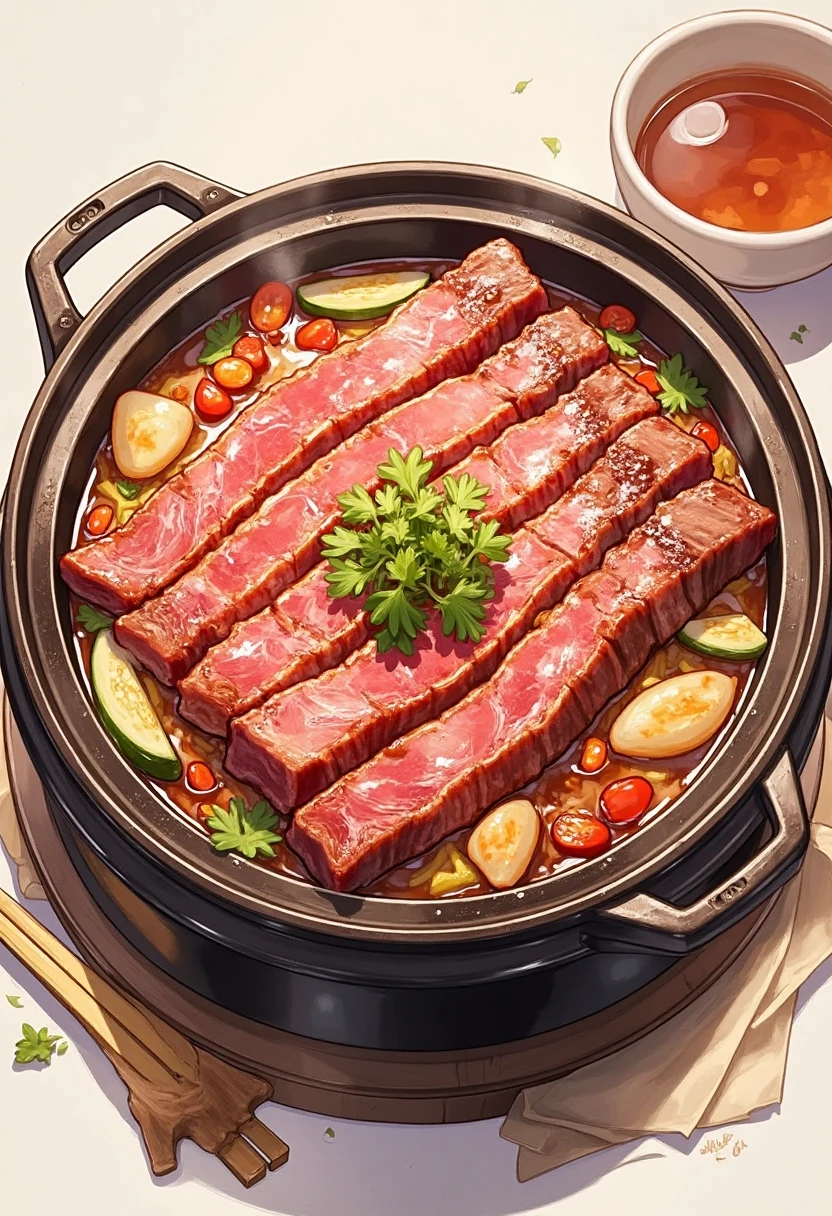 Food illustration style, hearty beef hot pot, thinly sliced meat, veggies, boiling broth, warm and inviting.